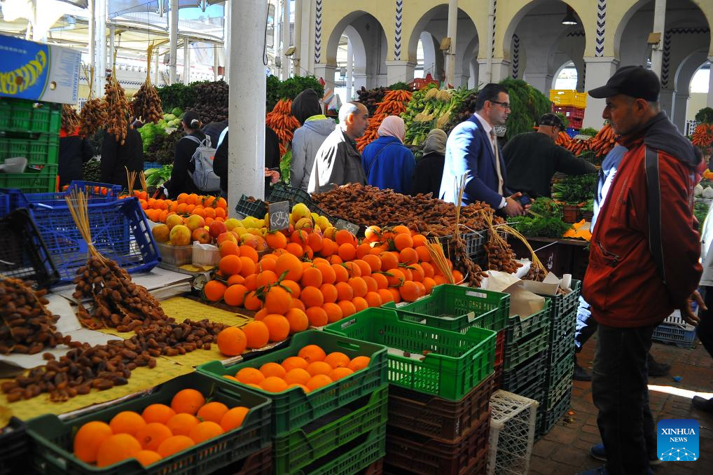 This photo taken on Feb. 19, 2026 shows a fruit stall on the first day of Ramadan in Tunis, Tunisia. (Photo by Adel Ezzine/Xinhua)