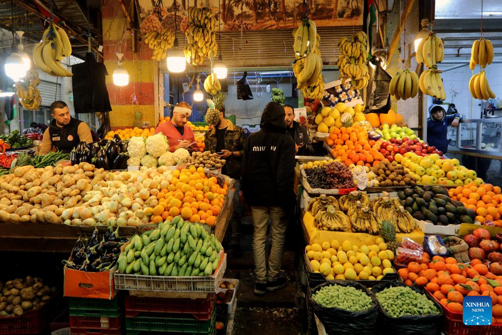 People visit a vegetable and fruit stall at a market during Ramadan in Amman, Jordan, on Feb. 19, 2026. (Photo by Mohammad Abu Ghosh/Xinhua)