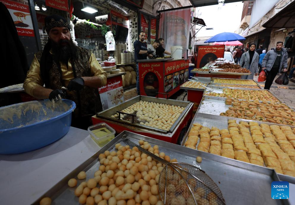 A vendor is seen making dessert in a market in Nablus, northern West Bank, on Feb. 19, 2026. (Photo by Ayman Nobani/Xinhua)