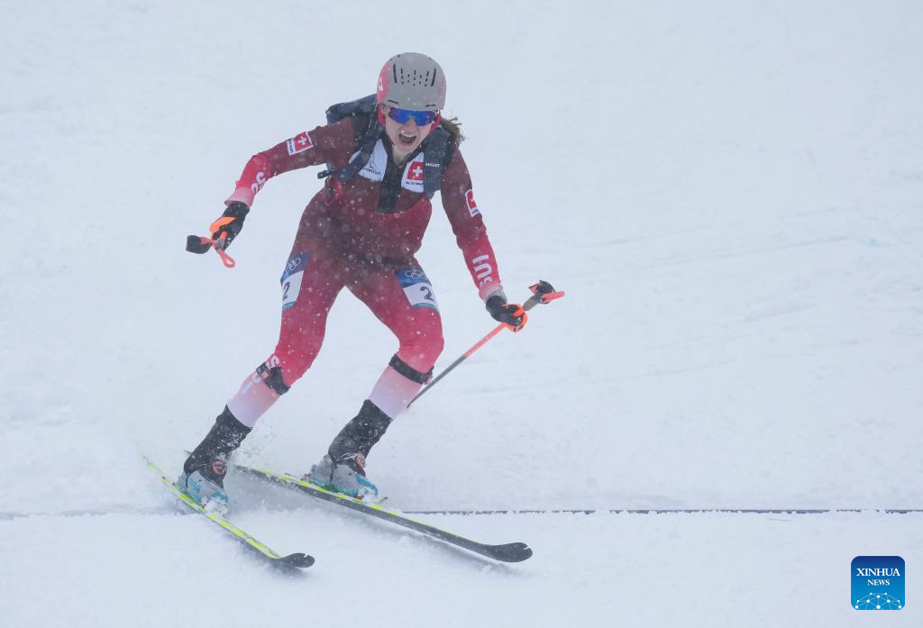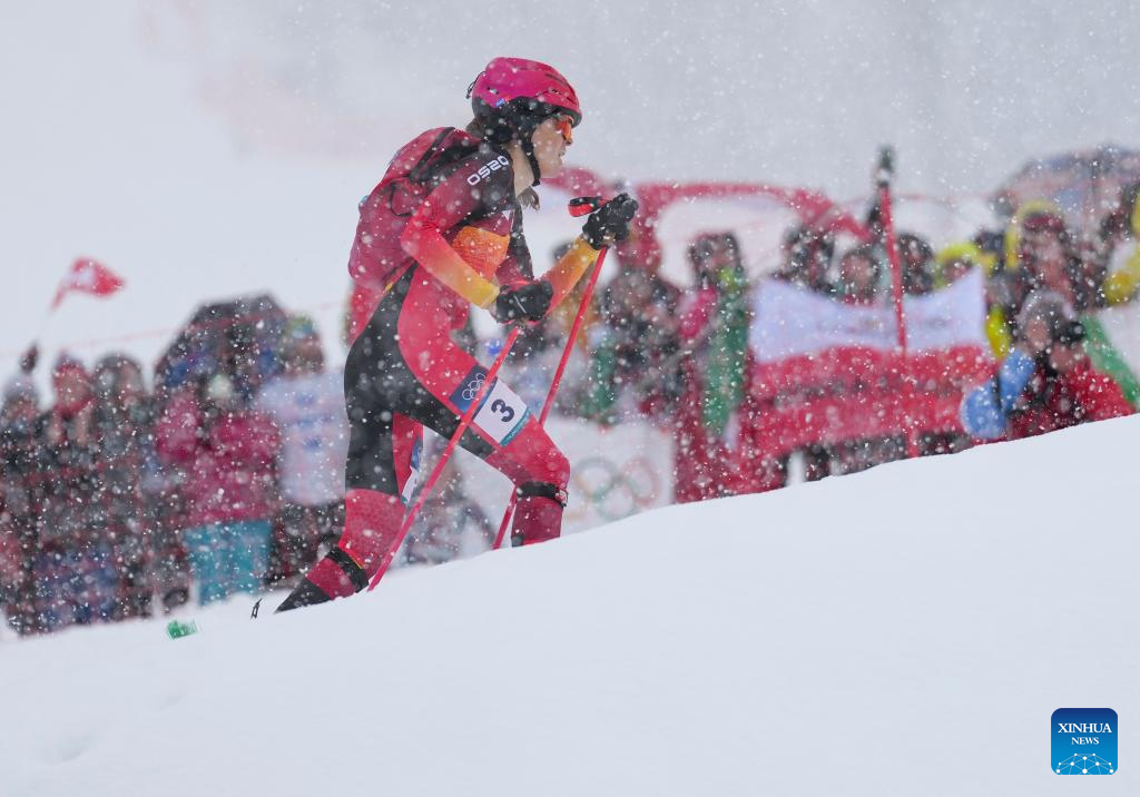 Marianne Fatton of Switzerland competes during the ski mountaineering women's sprint event at the Milan-Cortina 2026 Olympic Winter Games in Bormio, Italy, Feb. 19, 2026. (Xinhua/Hu Huhu)