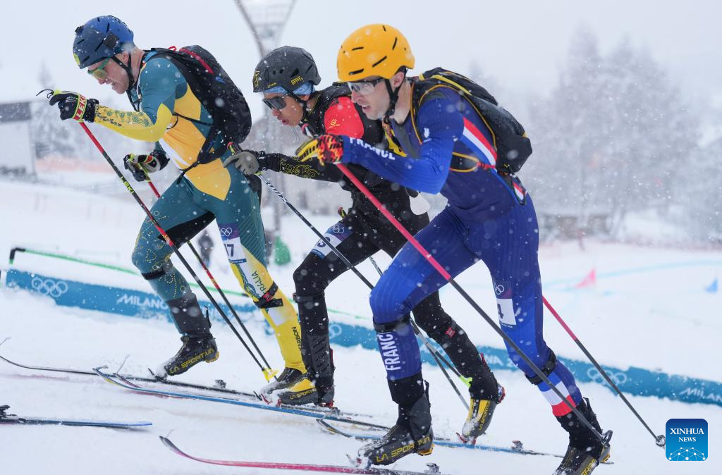 Thibault Anselmet of France, Bu Luer of China, Phillip Bellingham of Australia (R to L) compete during the ski mountaineering men's sprint event at the Milan-Cortina 2026 Olympic Winter Games in Bormio, Italy, Feb. 19, 2026. (Xinhua/Hu Huhu)