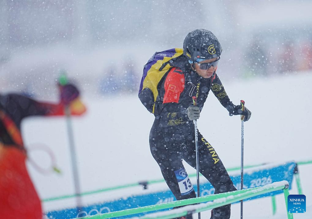 Bu Luer of China competes during the ski mountaineering men's sprint event at the Milan-Cortina 2026 Olympic Winter Games in Bormio, Italy, Feb. 19, 2026. (Xinhua/Yan Linyun)