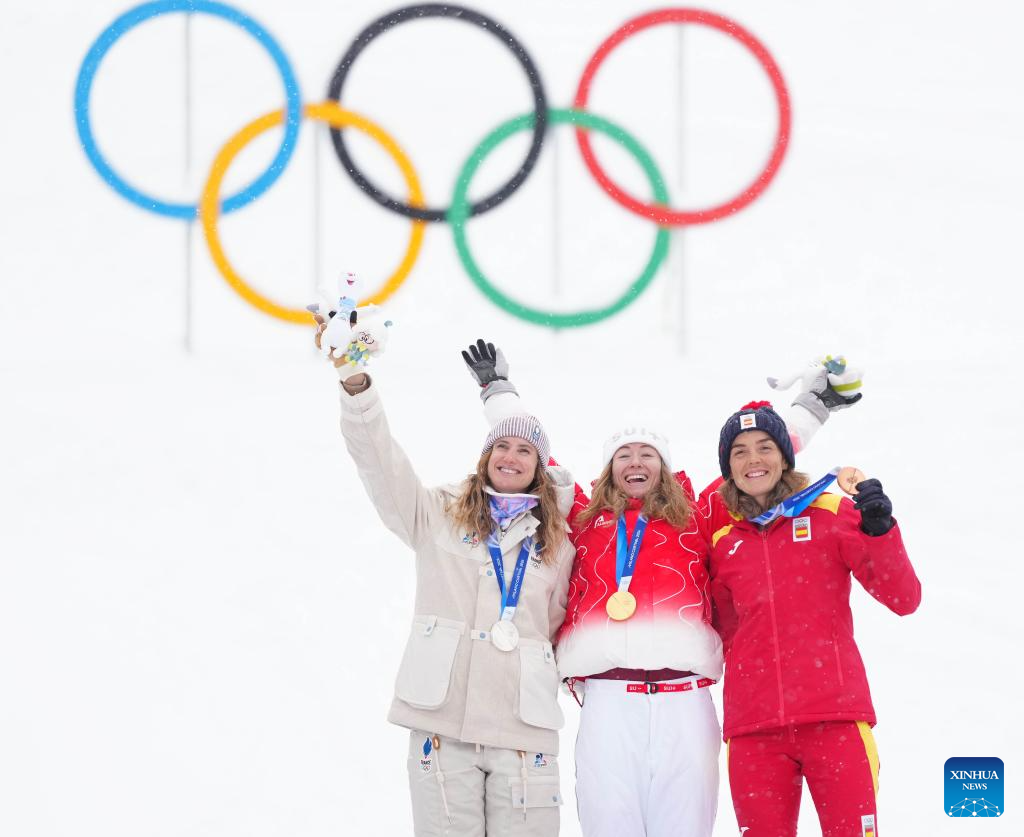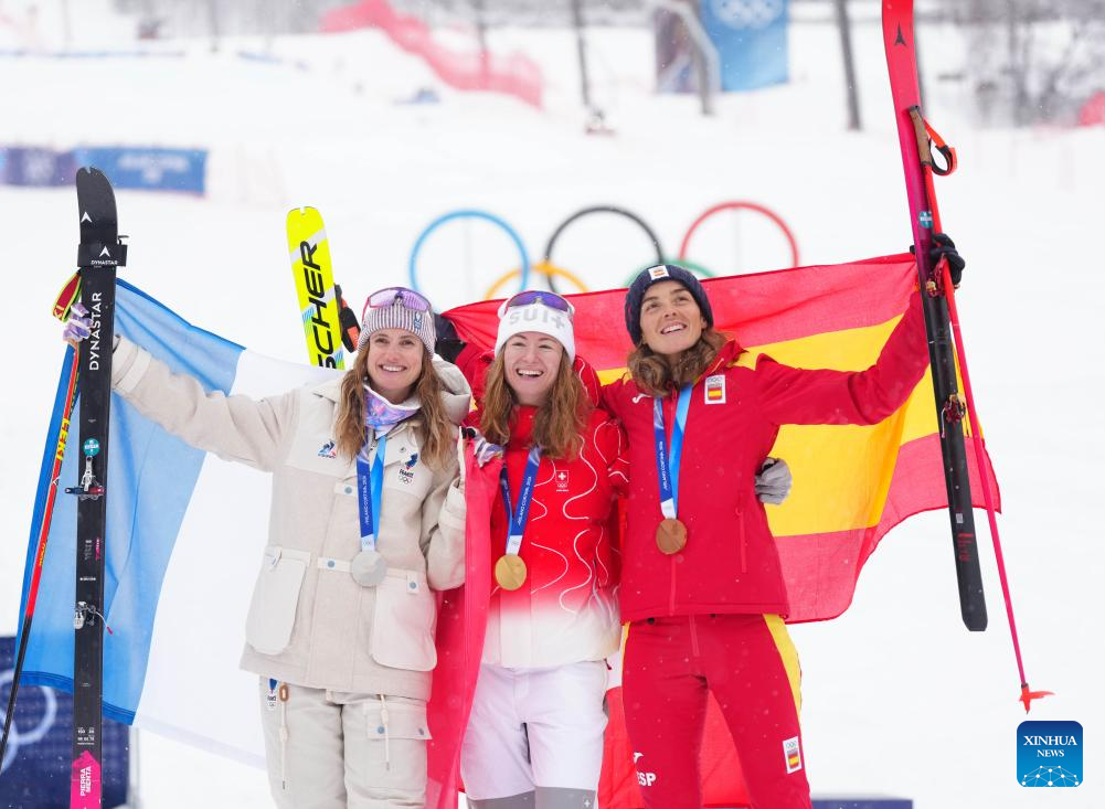 Gold medalist Marianne Fatton (C) of Switzerland, silver medalist Emily Harrop (L) of France, and bronze medalist Ana Alonso Rodriguez of Spain pose for photos during the awarding ceremony of the ski mountaineering women's sprint event at the Milan-Cortina 2026 Olympic Winter Games in Bormio, Italy, Feb. 19, 2026. (Xinhua/Yan Linyun)