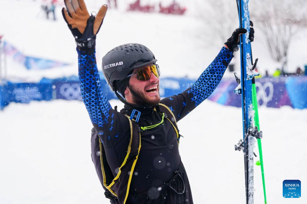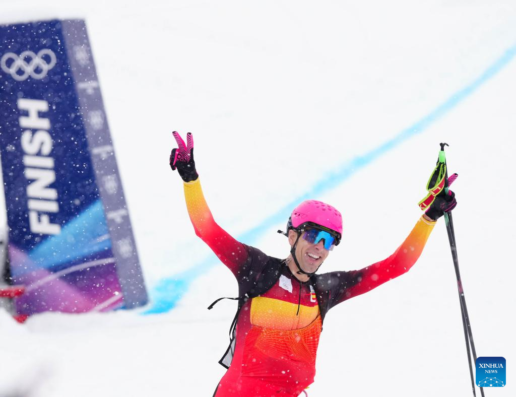 Oriol Cardona Coll of Spain celebrates after the ski mountaineering men's sprint event at the Milan-Cortina 2026 Olympic Winter Games in Bormio, Italy, Feb. 19, 2026. (Xinhua/Yan Linyun)