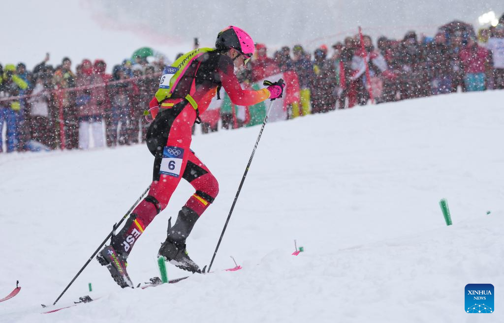 Ana Alonso Rodriguez of Spain competes during the ski mountaineering women's sprint event at the Milan-Cortina 2026 Olympic Winter Games in Bormio, Italy, Feb. 19, 2026. (Xinhua/Hu Huhu)