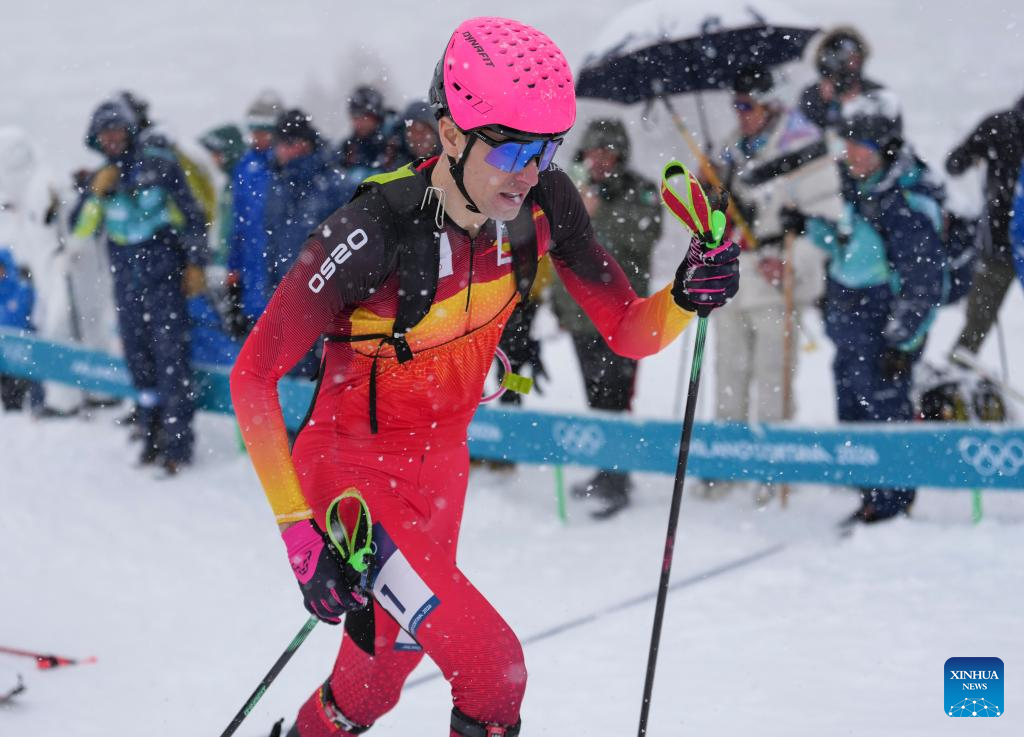 Ot Ferrer Martinez of Spain competes during the ski mountaineering men's sprint event at the Milan-Cortina 2026 Olympic Winter Games in Bormio, Italy, Feb. 19, 2026. (Xinhua/Hu Huhu)