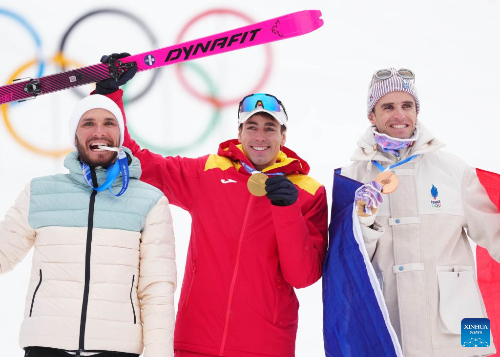 Oriol Cardona Coll of Spain poses for photos during the awarding ceremony of the ski mountaineering men's sprint event at the Milan-Cortina 2026 Olympic Winter Games in Bormio, Italy, Feb. 19, 2026. (Xinhua/Hu Huhu)