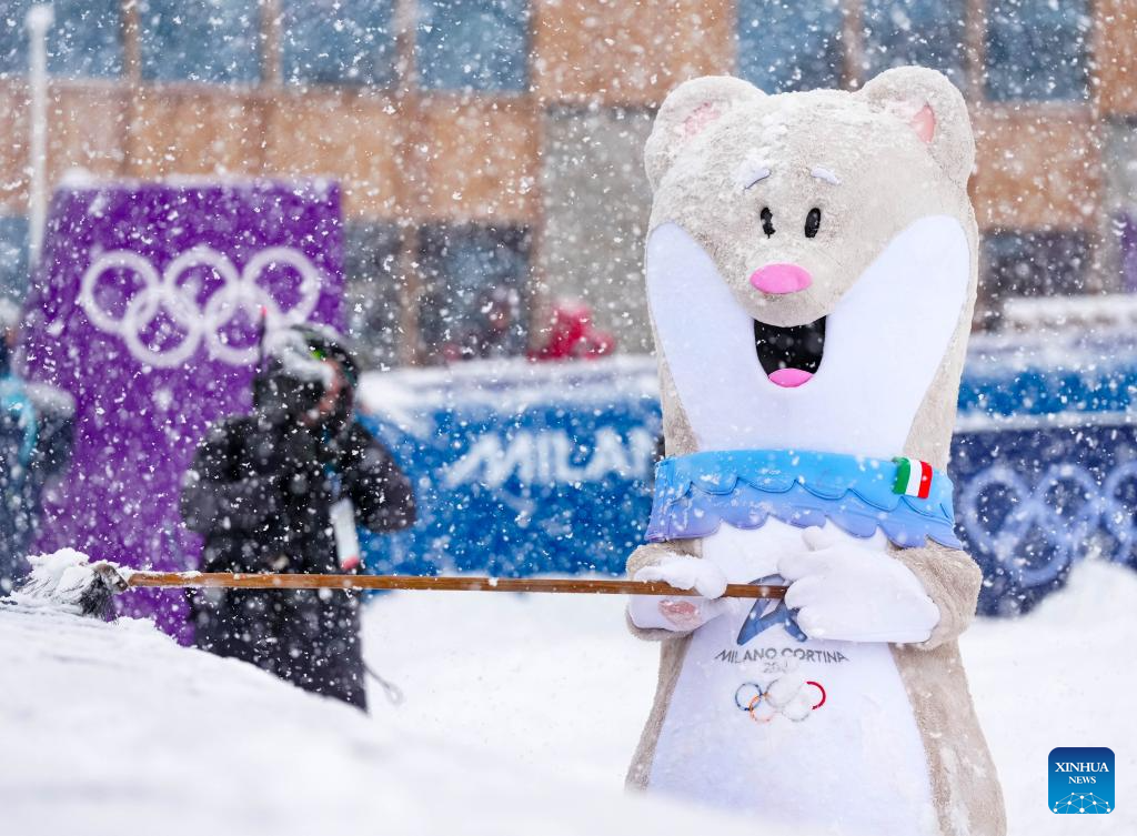 Mascot Tina shovels snow before the ski mountaineering women's sprint event at the Milan-Cortina 2026 Olympic Winter Games in Bormio, Italy, Feb. 19, 2026. (Xinhua/Yan Linyun)