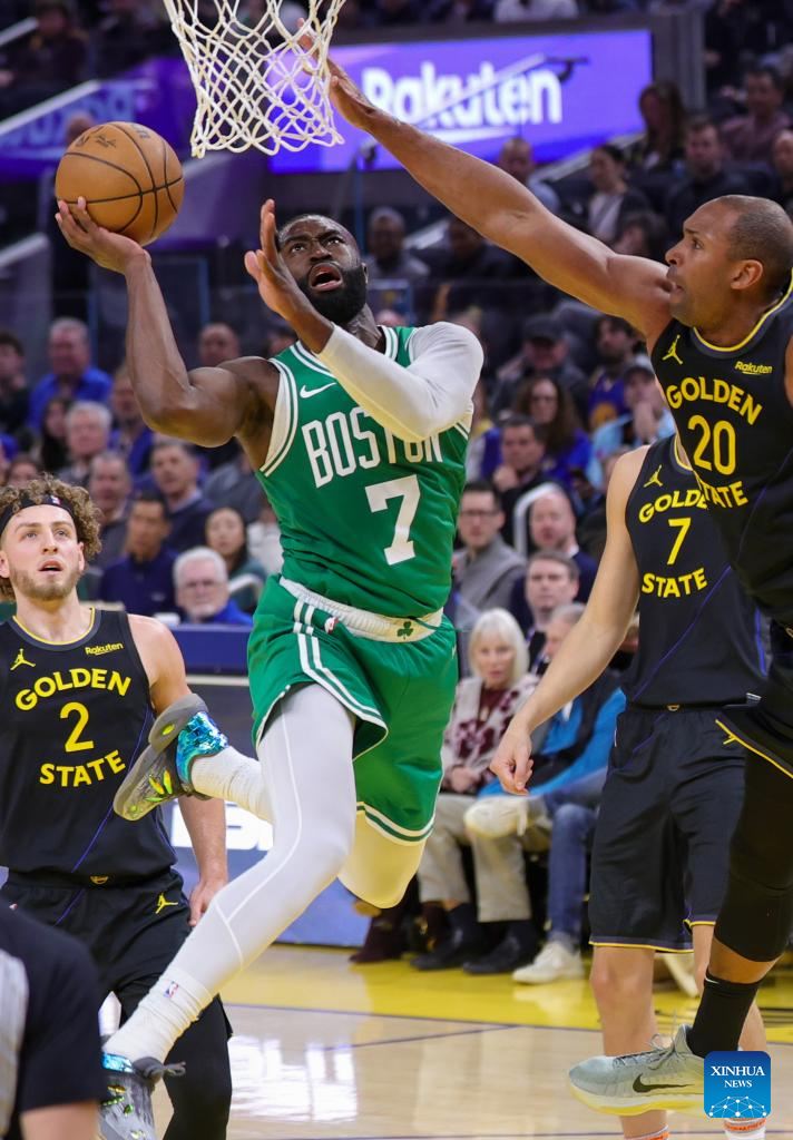 Jaylen Brown (C) of Boston Celtics goes for a layup during the 2025-2026 NBA regular season game between Golden State Warriors and Boston Celtics in San Francisco, the United States, Feb. 19, 2026. (Photo by Arthur Dong/Xinhua)