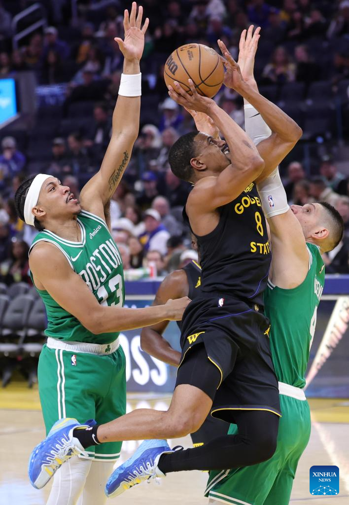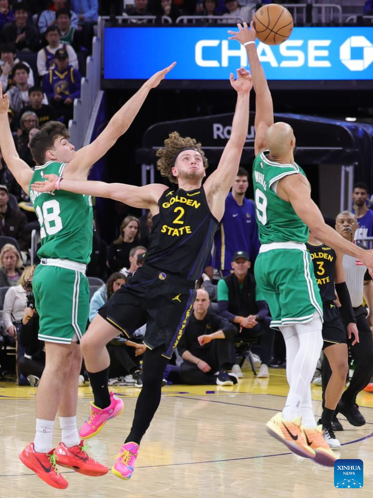 Brandin Podziemski (C) of Golden State Warriors vies for the ball during the 2025-2026 NBA regular season game between Golden State Warriors and Boston Celtics in San Francisco, the United States, Feb. 19, 2026. (Photo by Arthur Dong/Xinhua)