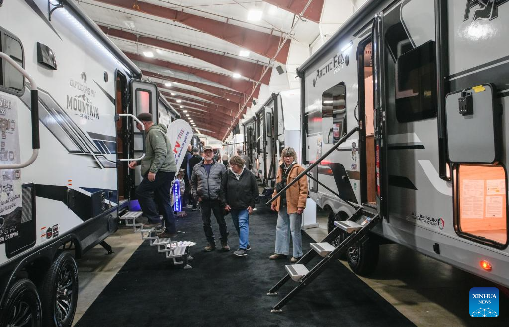 People attend the 2026 Earlybird RV (recreational vehicles) Show & Sale in Abbotsford, British Columbia, Canada, on Feb. 19, 2026. The four-day event kicked off here on Thursday. (Photo by Liang Sen/Xinhua)