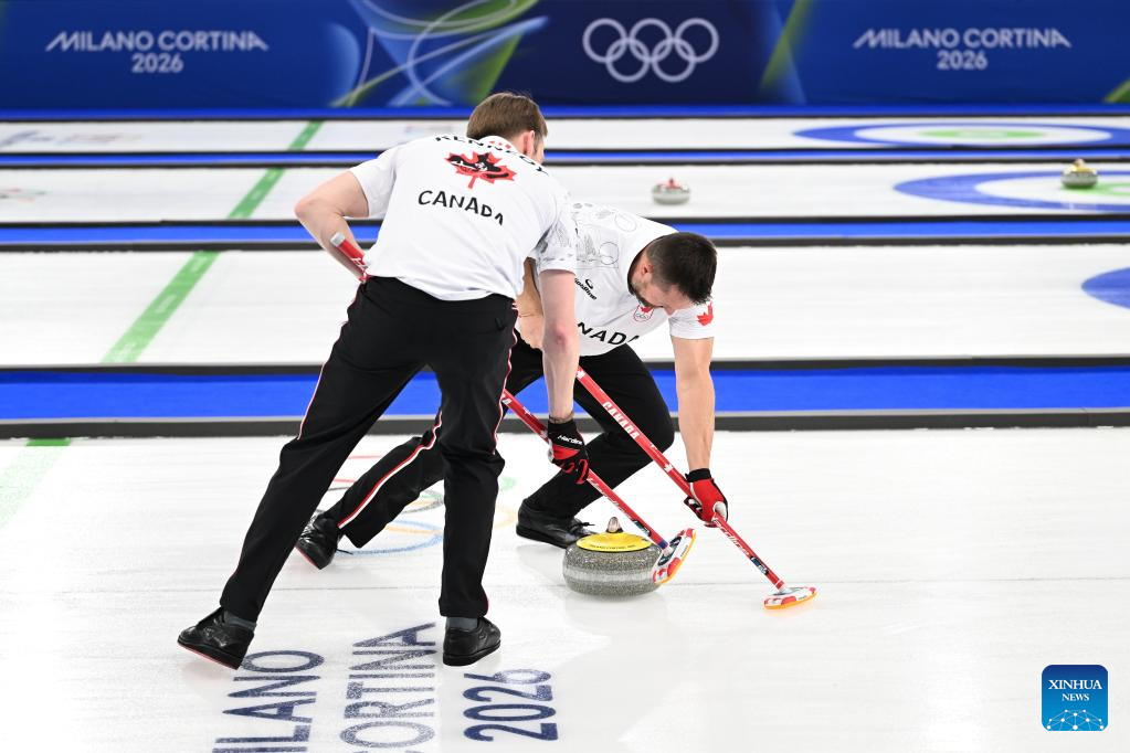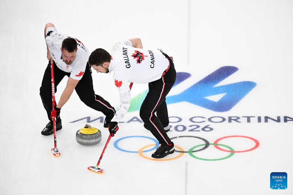 Ben Hebert (R) of Canada competes during the curling men's semi-final match between Norway and Canada at the 2026 Milan-Cortina Winter Olympics in Cortina, Italy, Feb. 19, 2026. (Xinhua/Lian Yi)