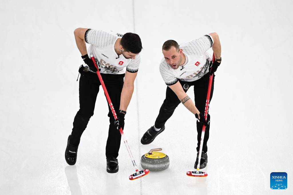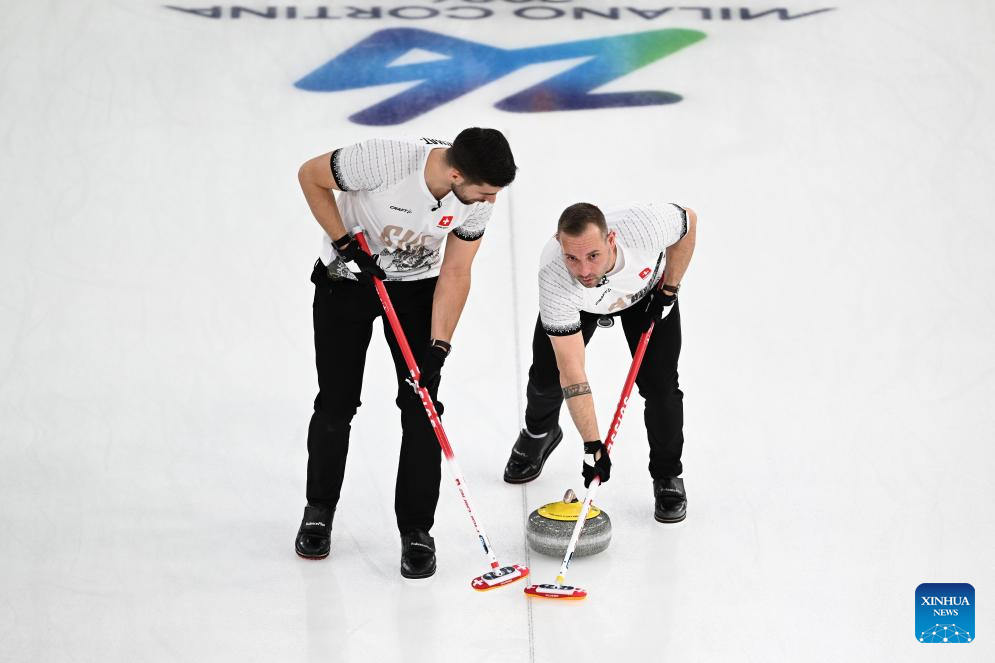 Sven Michel (R) of Switzerland competes during the curling men's semi-final match between Britain and Switzerland at the 2026 Milan-Cortina Winter Olympics in Cortina, Italy, Feb. 19, 2026. (Xinhua/Lian Yi)