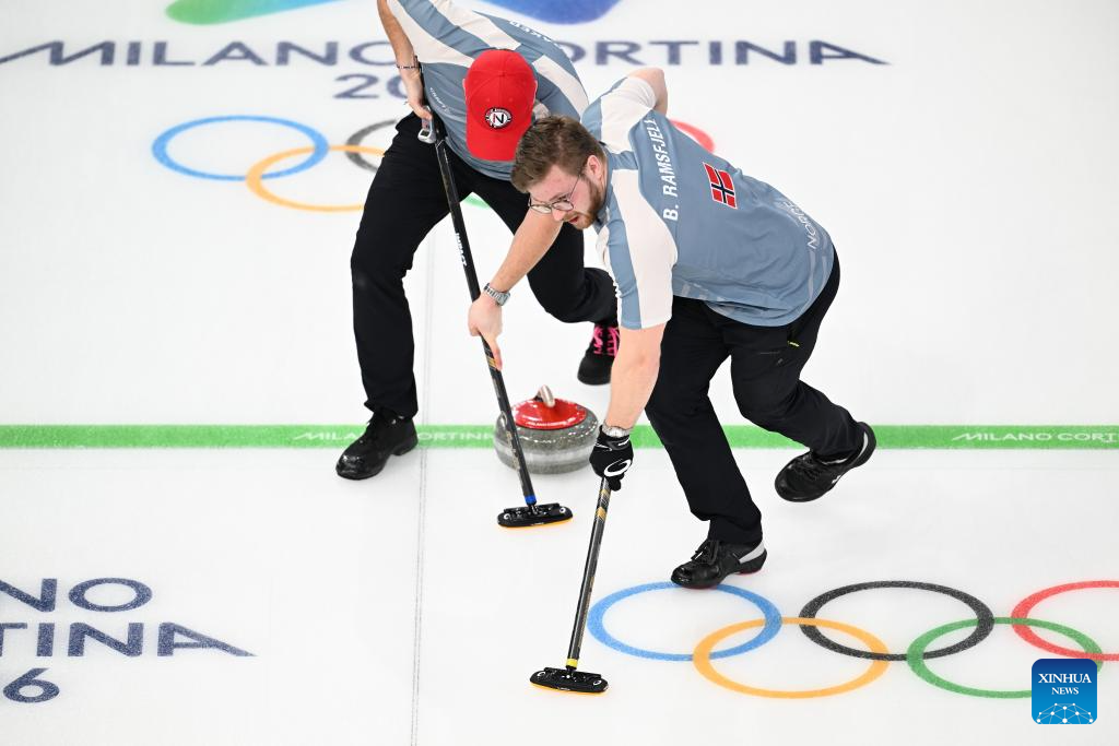 Bendik Ramsfjell (R) of Norway competes during the curling men's semi-final match between Norway and Canada at the 2026 Milan-Cortina Winter Olympics in Cortina, Italy, Feb. 19, 2026. (Xinhua/Lian Yi)