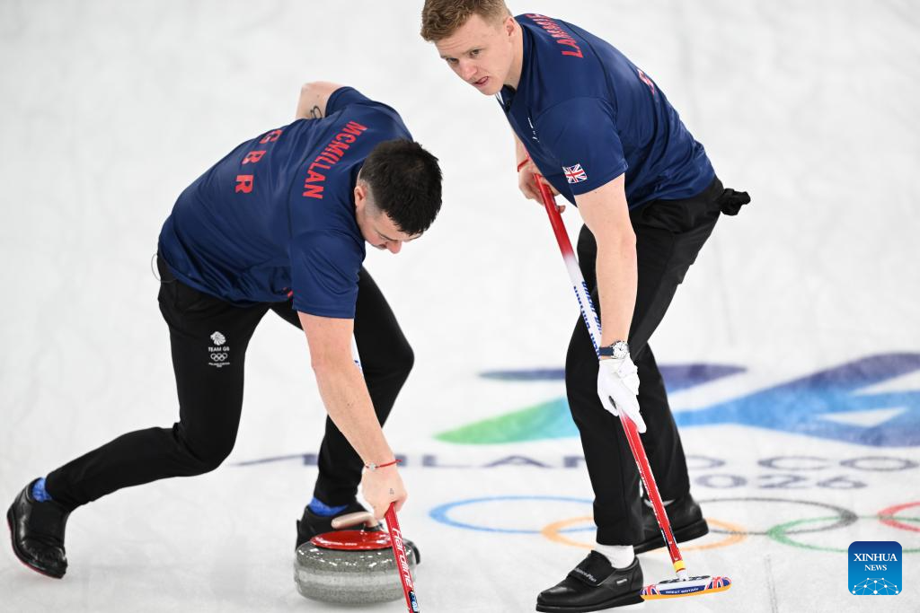 Bobby Lammie (R) of Britain competes during the curling men's semi-final match between Britain and Switzerland at the 2026 Milan-Cortina Winter Olympics in Cortina, Italy, Feb. 19, 2026. (Xinhua/Lian Yi)