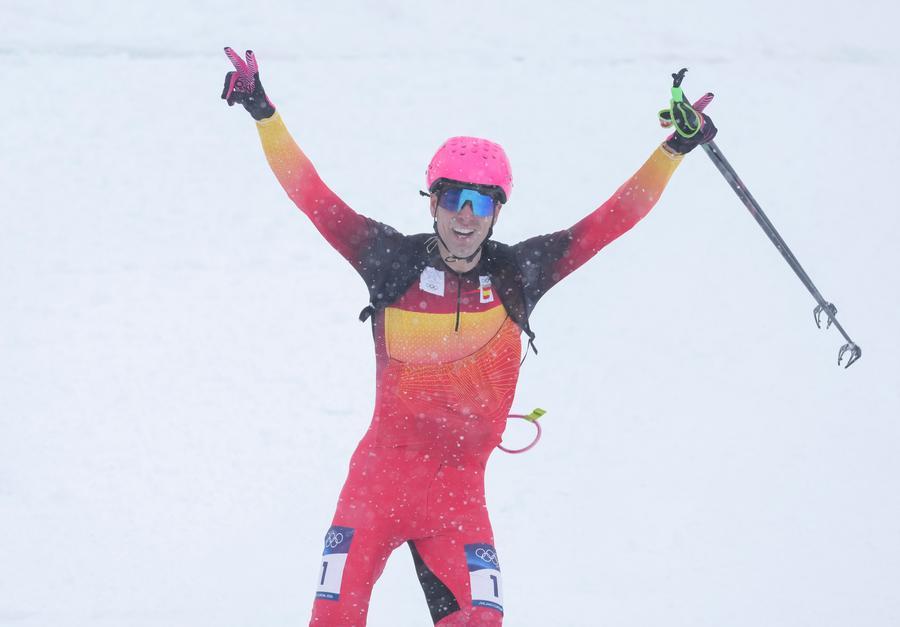 BORMIO, Italy, Feb. 19 (Xinhua) -- Oriol Cardona Coll of Spain and Switzerland's Marianne Fatton captured the first-ever Olympic gold medals in ski mountaineering on Thursday, as the sport made its debut amidst blizzard conditions at the Milan-Cortina 2026 Olympic Winter Games.