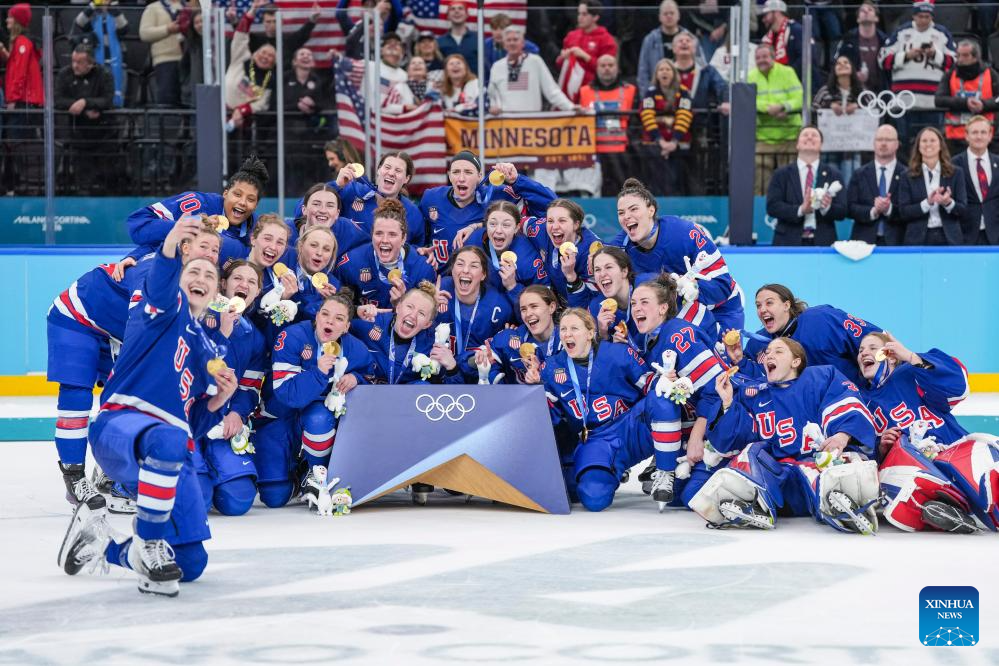 Gold medalists players of the United States pose for photos during the awarding ceremony for the ice hockey women's gold medal game between the United States and Canada at the Milan-Cortina 2026 Olympic Winter Games in Milan, Italy, Feb. 19, 2026. (Xinhua/Sun Fei)