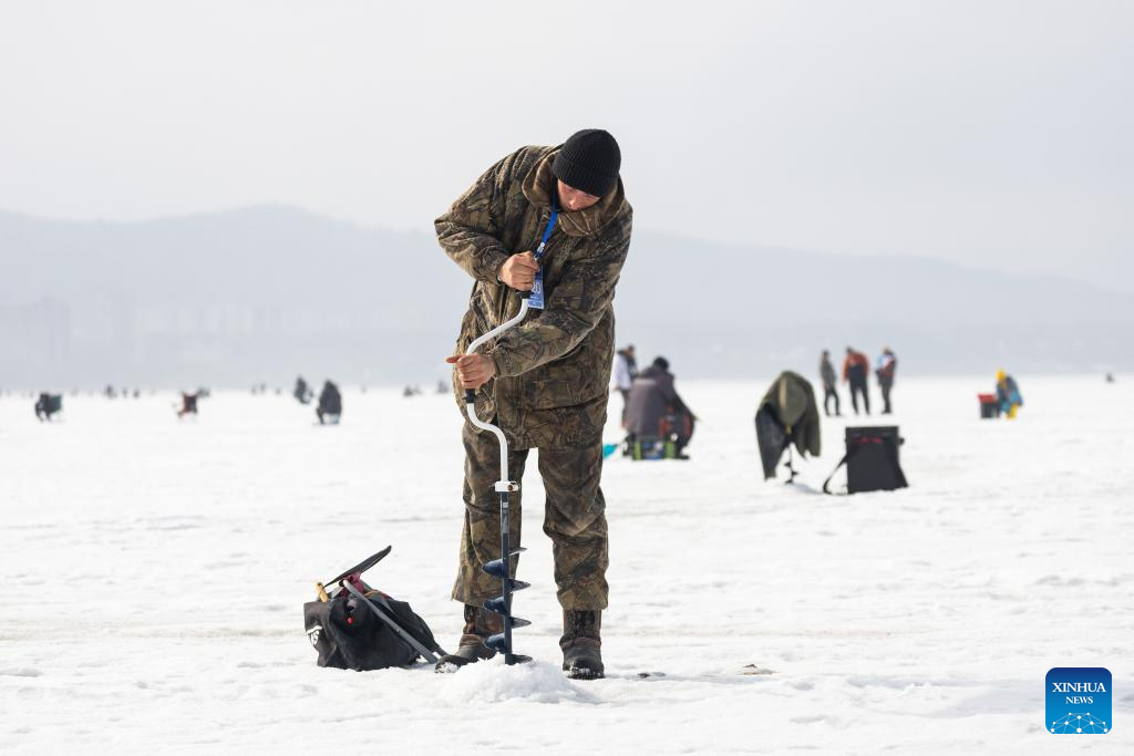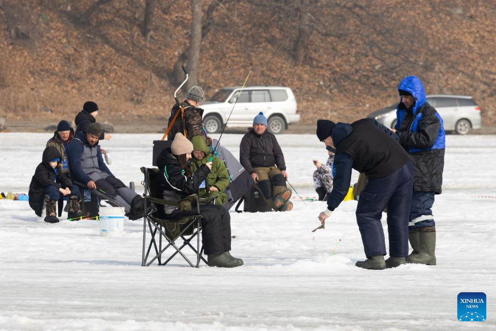 People take part in an ice fishing competition in Vladivostok, Russia, Feb. 21, 2026. (Photo by Andrey Matveenko/Xinhua)