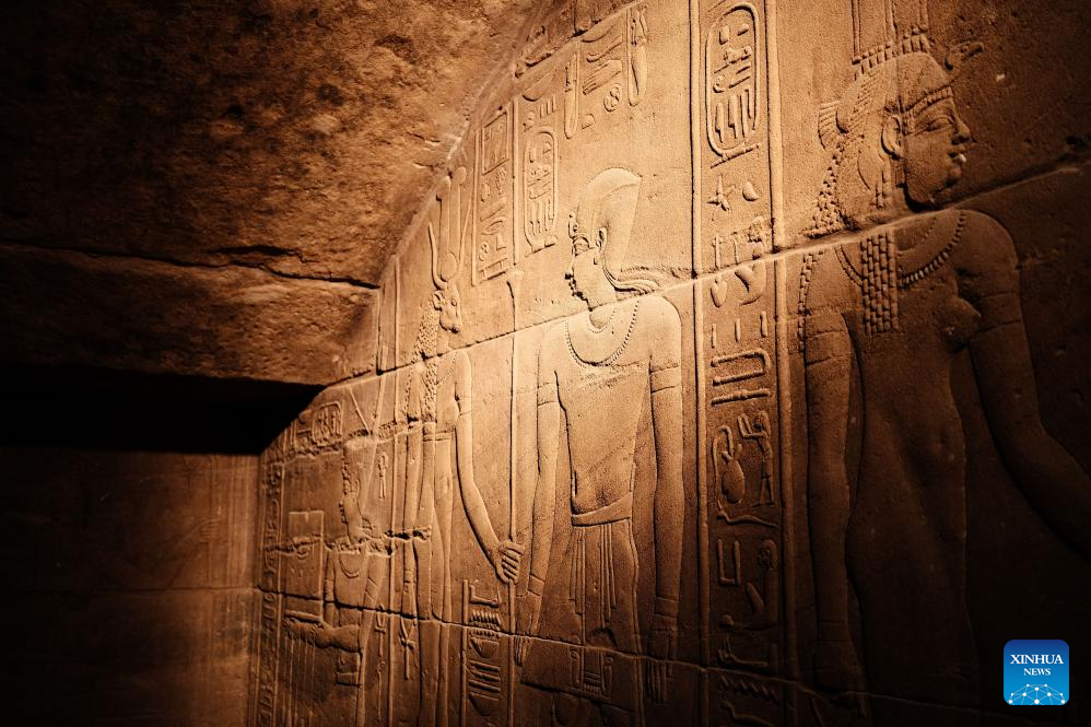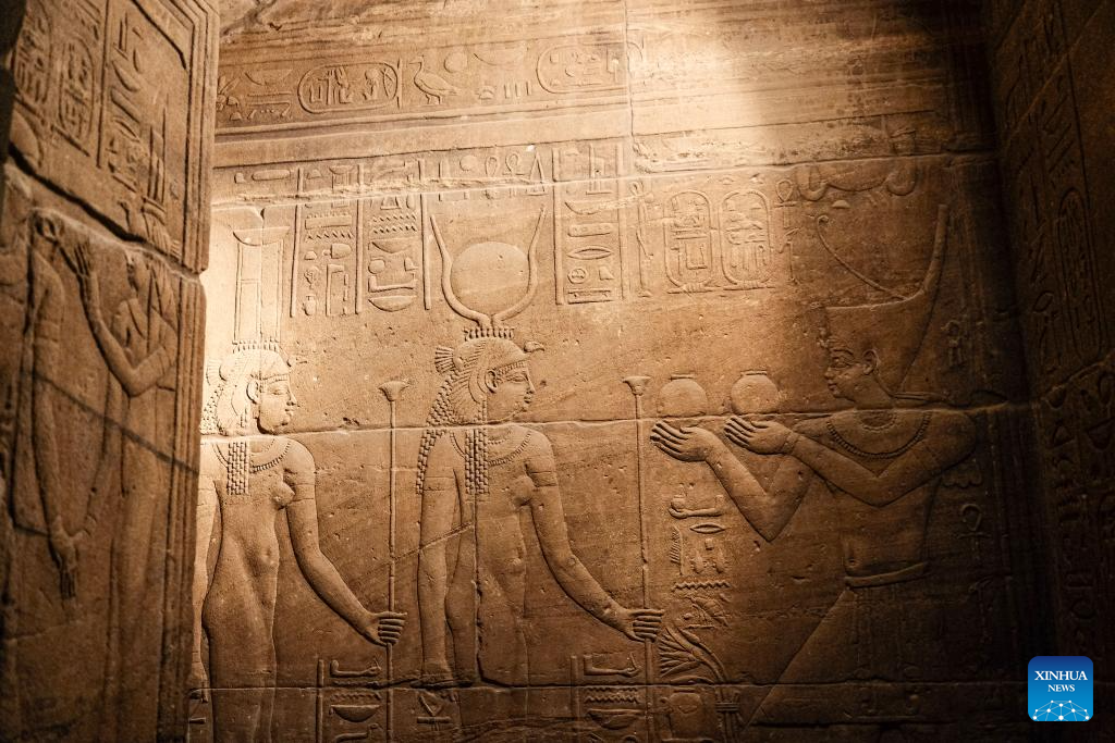 This photo taken on Feb. 21, 2026 shows reliefs inside the Philae Temple complex in Aswan, Egypt. Built mainly during the Ptolemaic period and dedicated to the goddess Isis, the Philae Temple complex's structures feature floral capitals, hieroglyph-covered walls, and reliefs of ancient deities.