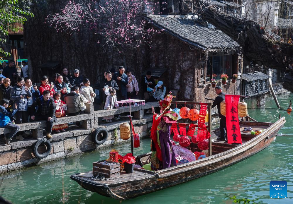 Artists participate in a parade on water in Wuzhen, Tongxiang City, east China's Zhejiang Province, Feb. 21, 2026. During this Spring Festival holiday, the ancient water town of Wuzhen launched over sixty activities which present the town's rich history and modern vitality reflected in folk customs, drama, science and technology, and culture. (Xinhua/Xu Yu)