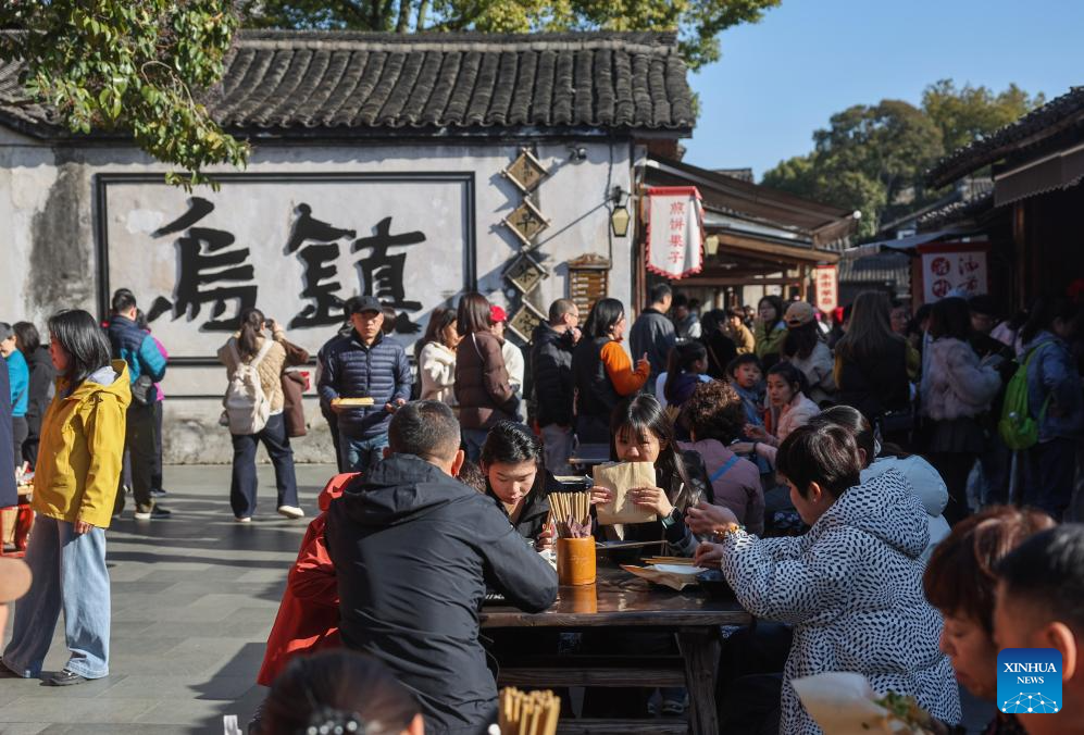 Tourists have breakfast at a morning market in Wuzhen, Tongxiang City, east China's Zhejiang Province, Feb. 21, 2026. During this Spring Festival holiday, the ancient water town of Wuzhen launched over sixty activities which present the town's rich history and modern vitality reflected in folk customs, drama, science and technology, and culture. (Xinhua/Xu Yu)