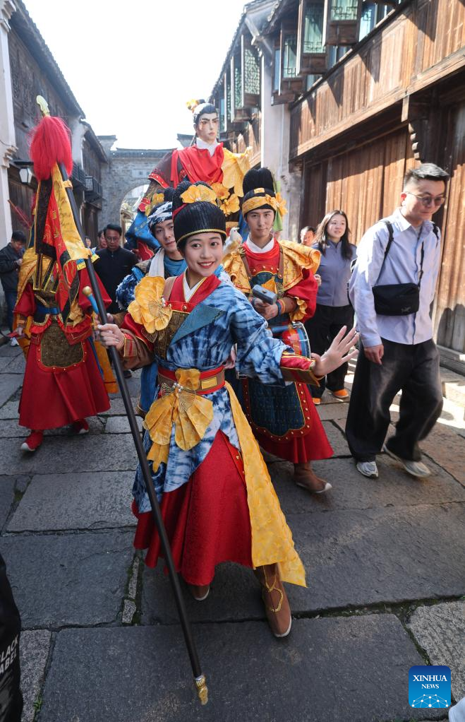Artists perform during a parade in Wuzhen, Tongxiang City, east China's Zhejiang Province, Feb. 21, 2026. During this Spring Festival holiday, the ancient water town of Wuzhen launched over sixty activities which present the town's rich history and modern vitality reflected in folk customs, drama, science and technology, and culture. (Xinhua/Xu Yu)