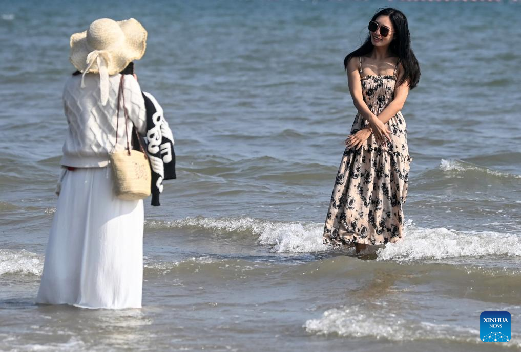 A woman poses for photos on a beach in Fangchenggang, south China's Guangxi Zhuang Autonomous Region, Feb. 20, 2026. On the fourth day of the Chinese New Year, many tourists flocked into the beach here to celebrate the festival. (Xinhua/Zhang Ailin)