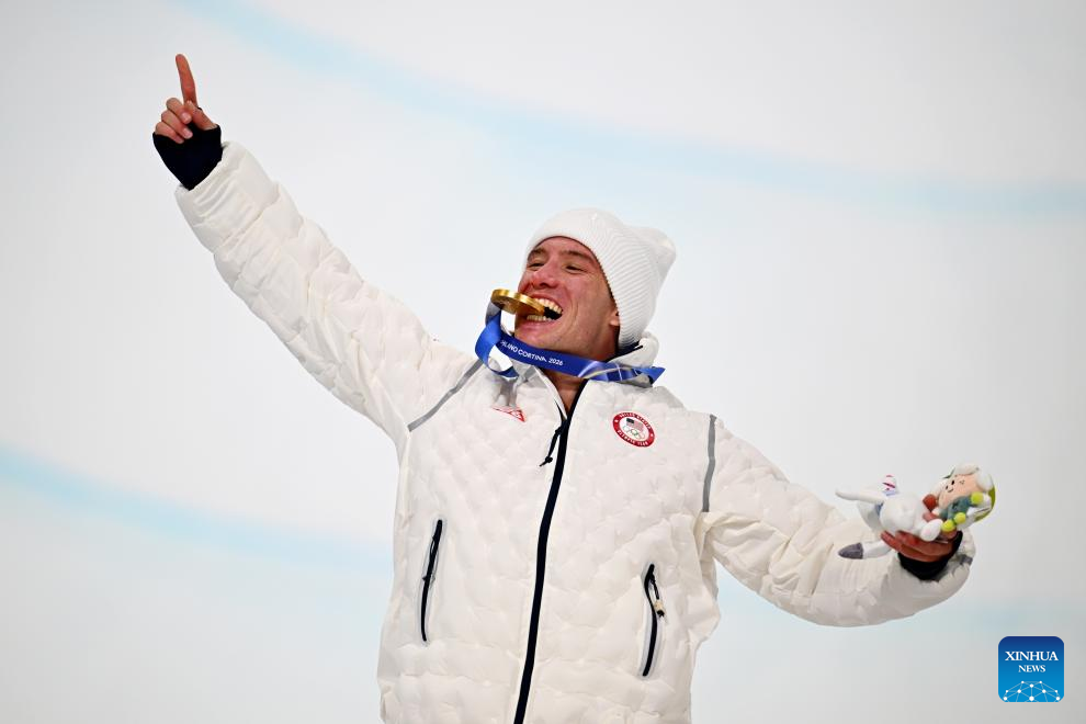 Gold medalist Alex Ferreira of the United States reacts during the awarding ceremony after the freestyle skiing men's freeski halfpipe final at the Milan-Cortina 2026 Olympic Winter Games in Livigno, Italy, Feb. 20, 2026. (Xinhua/Zhang Hongxiang)
