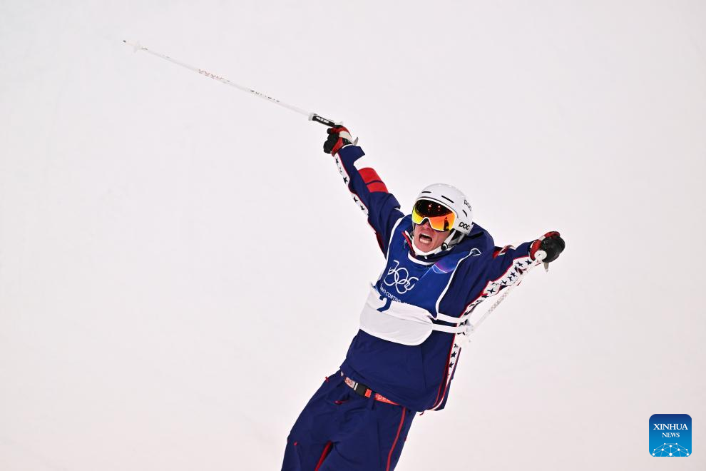 Alex Ferreira of the United States celebrates during the freestyle skiing men's freeski halfpipe final at the Milan-Cortina 2026 Olympic Winter Games in Livigno, Italy, Feb. 20, 2026. (Xinhua/Zhang Hongxiang)
