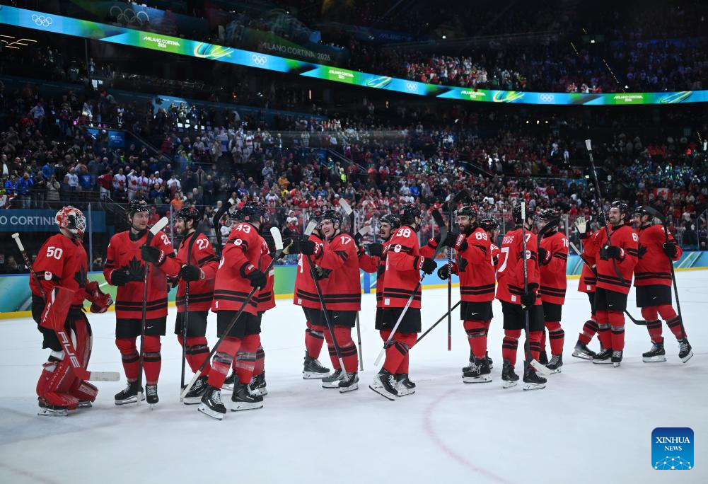 Players of Canada celebrate winning the ice hockey men's play-offs semifinal match between Canada and Finland at the Milan-Cortina 2026 Olympic Winter Games in Milan, Italy, Feb. 20, 2026. (Xinhua/Zhang Haofu)