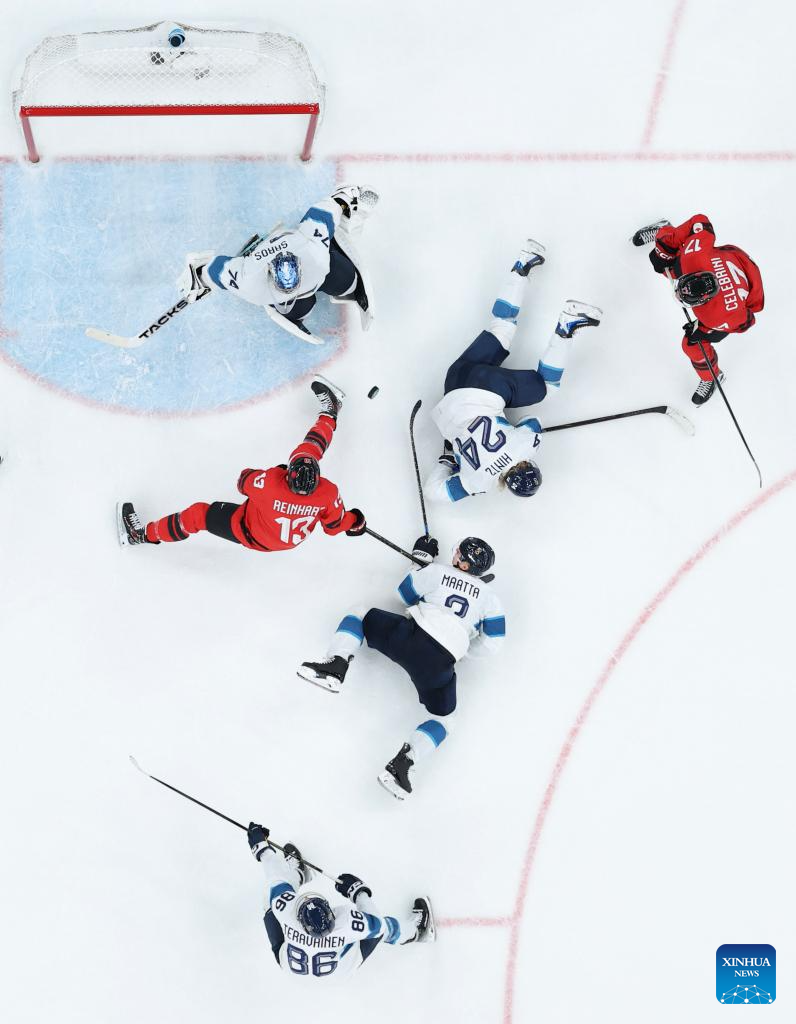 Sam Reinhart (L, top) of Canada shoots during the ice hockey men's play-offs semifinal match between Canada and Finland at the Milan-Cortina 2026 Olympic Winter Games in Milan, Italy, Feb. 20, 2026. (Xinhua/Zhang Haofu)