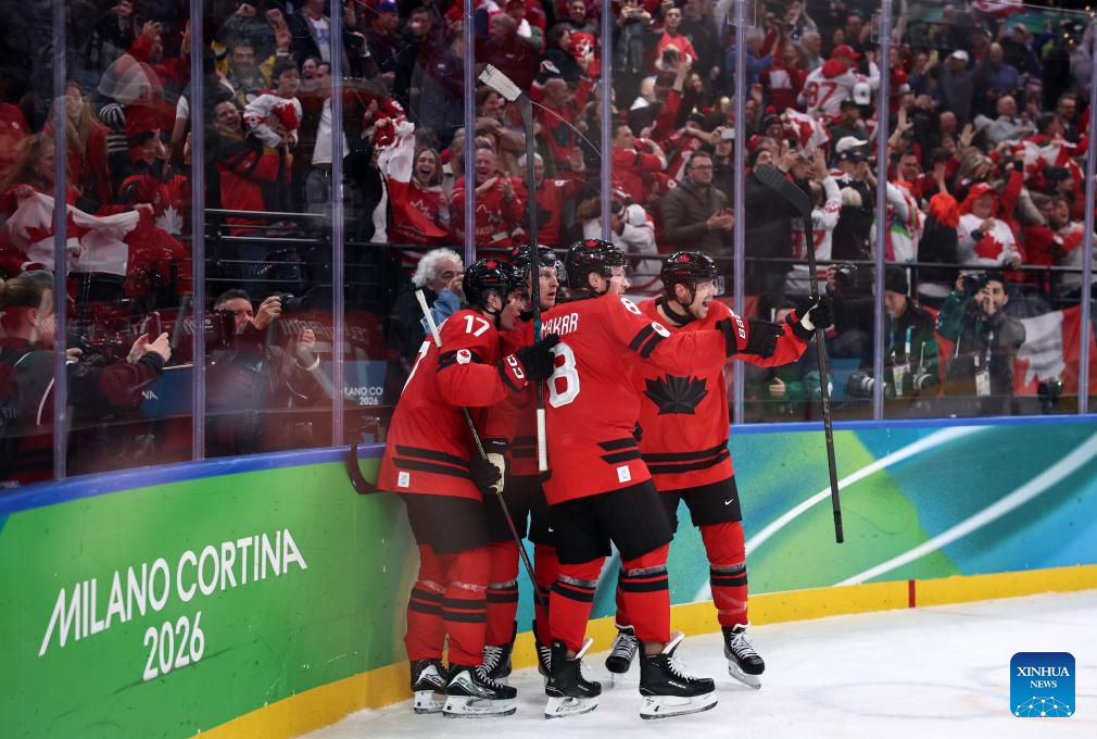 Players of Canada celebrate scoring during the ice hockey men's play-offs semifinal match between Canada and Finland at the Milan-Cortina 2026 Olympic Winter Games in Milan, Italy, Feb. 20, 2026. (Xinhua/Wang Kaiyan)