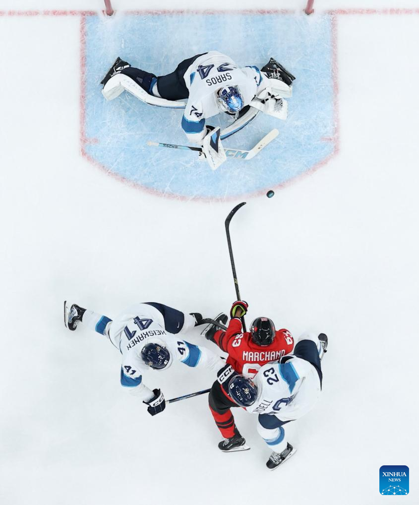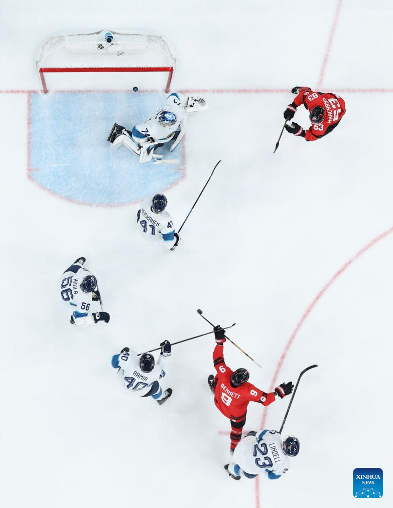 Sam Bennett (2nd L) of Canada vies for the puck during the ice hockey men's play-offs semifinal match between Canada and Finland at the Milan-Cortina 2026 Olympic Winter Games in Milan, Italy, Feb. 20, 2026. (Xinhua/Wang Kaiyan)