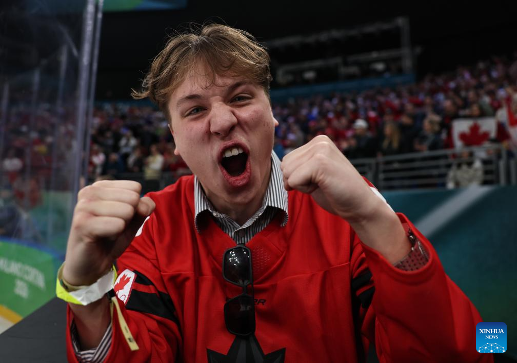 Spectators cheer for players of Canada during the ice hockey men's play-offs semifinal match between Canada and Finland at the Milan-Cortina 2026 Olympic Winter Games in Milan, Italy, Feb. 20, 2026. (Xinhua/Zhang Haofu)