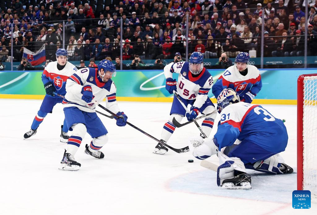 Players of both teams fight during the ice hockey men's play-offs semifinal match between the United States and Slovakia at the Milan-Cortina 2026 Olympic Winter Games in Milan, Italy, Feb. 20, 2026. (Xinhua/Wang Kaiyan)
