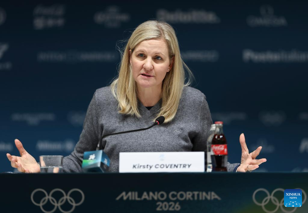 International Olympic Committee (IOC) President Kirsty Coventry attends a press conference in Milan, Italy, Feb. 20, 2026. (Xinhua/Hu Xingyu)