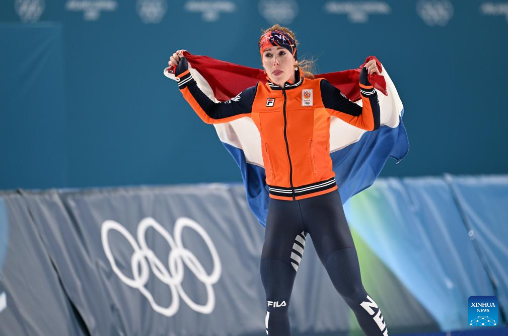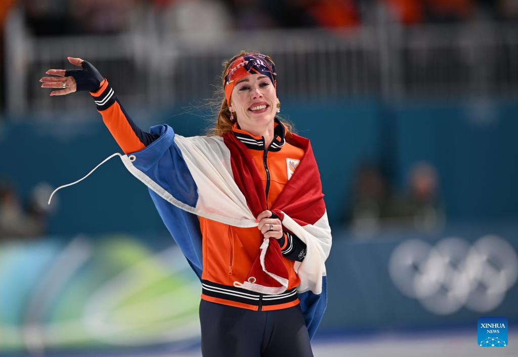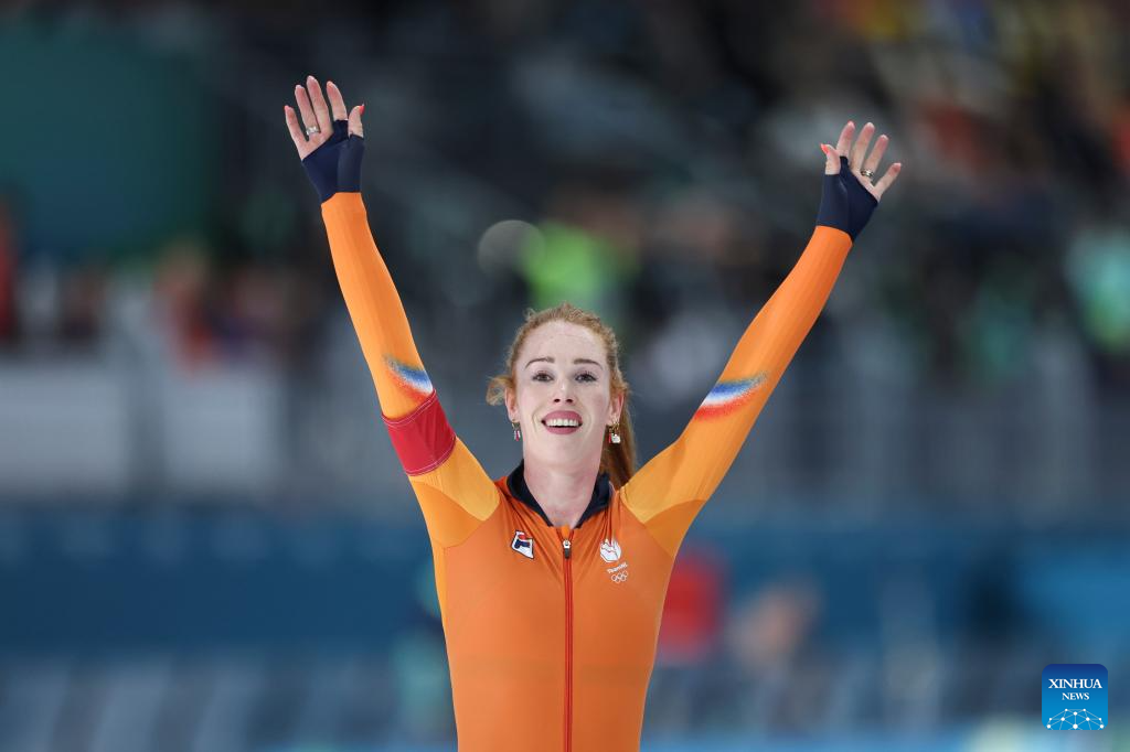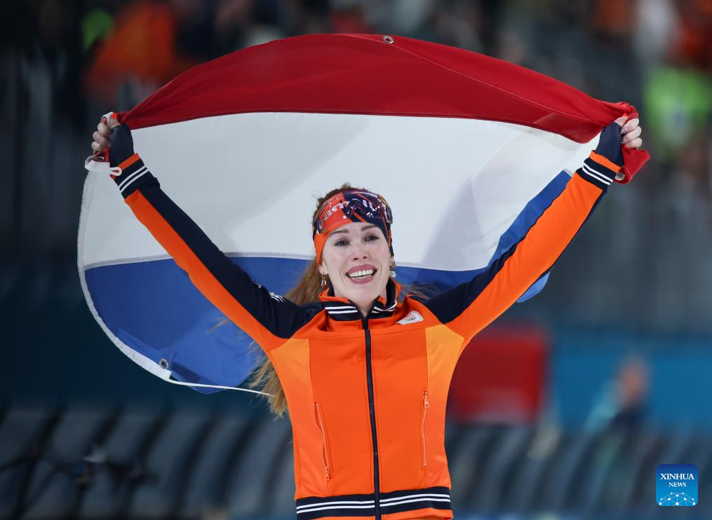 Antoinette Rijpma-de Jong of the Netherlands celebrates after the speed skating women's 1500m event at the Milan-Cortina 2026 Olympic Winter Games in Milan, Italy, Feb. 20, 2026. (Xinhua/Li Jing)