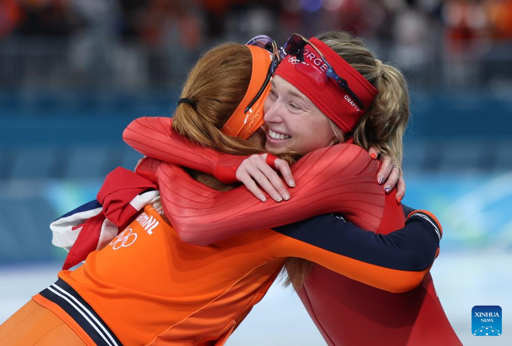 Gold medalist Antoinette Rijpma-de Jong (L) of the Netherlands hugs silver medalist Ragne Wiklund of Norway after the speed skating women's 1500m event at the Milan-Cortina 2026 Olympic Winter Games in Milan, Italy, Feb. 20, 2026. (Xinhua/Du Xiaoyi)