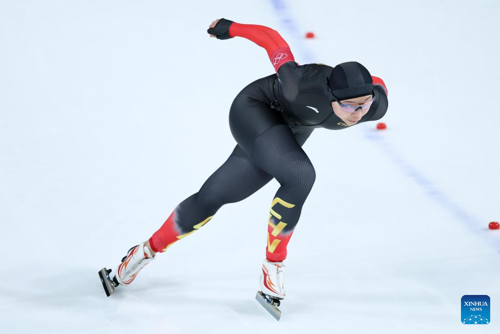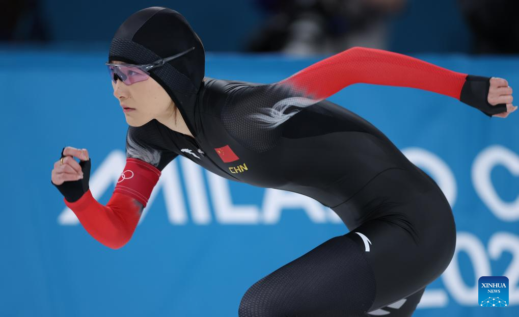 Yin Qi of China competes during the speed skating women's 1500m event at the Milan-Cortina 2026 Olympic Winter Games in Milan, Italy, Feb. 20, 2026. (Xinhua/Li Jing)
