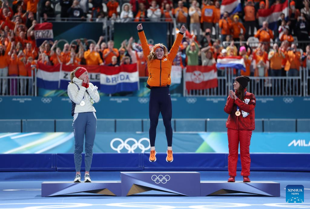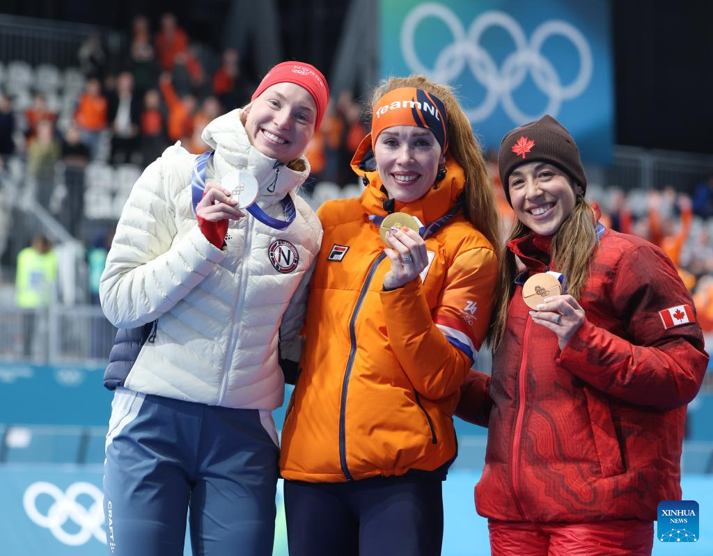 Gold medalist Antoinette Rijpma-de Jong (C) of the Netherlands, silver medalist Ragne Wiklund (L) of Norway, and bronze medalist Valerie Maltais of Canada attend the awarding ceremony of the speed skating women's 1500m event at the Milan-Cortina 2026 Olympic Winter Games in Milan, Italy, Feb. 20, 2026. (Xinhua/Wu Wei)