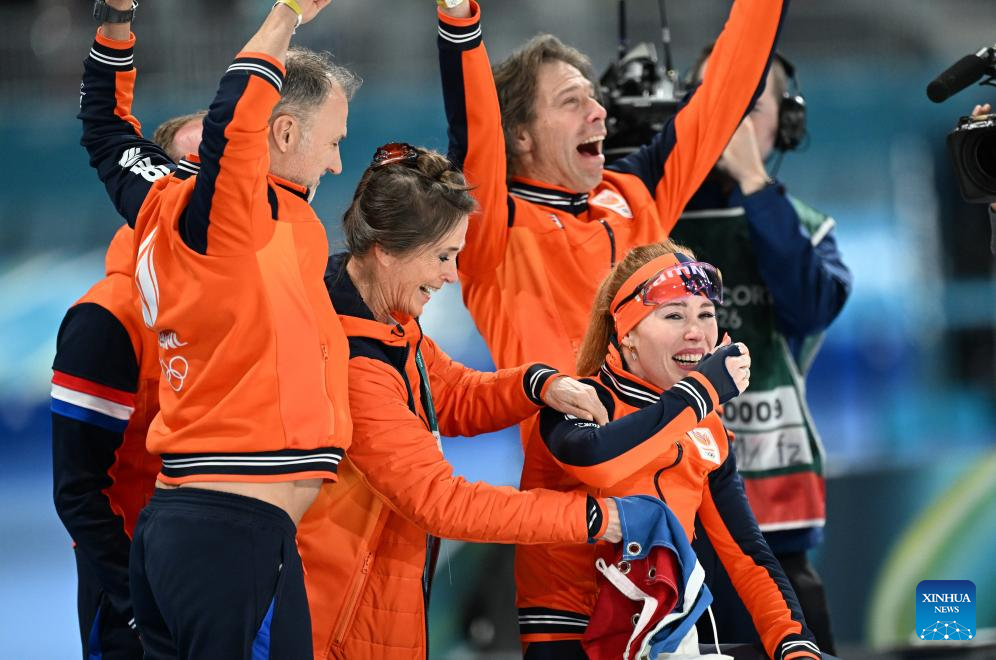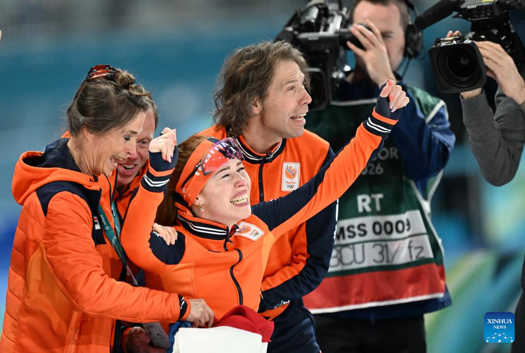 Antoinette Rijpma-de Jong (C, front) of the Netherlands celebrates after winning the speed skating women's 1500m event at the Milan-Cortina 2026 Olympic Winter Games in Milan, Italy, Feb. 20, 2026. (Xinhua/Wu Wei)