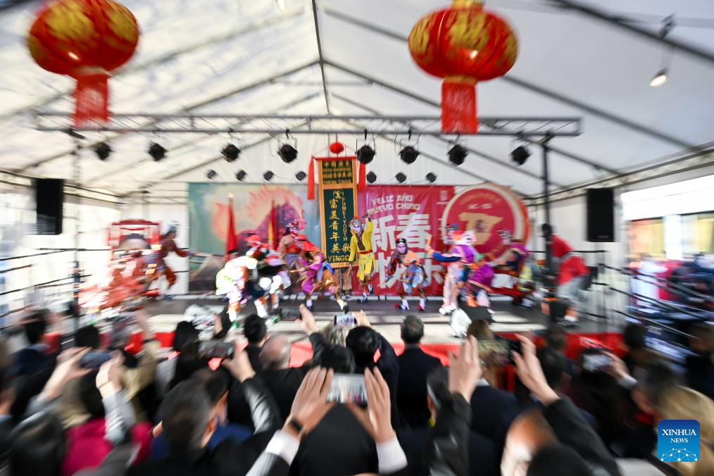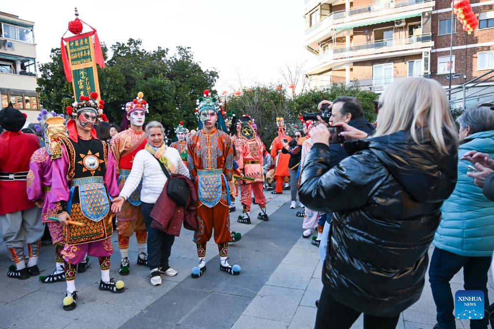 Yingge dancers from Guangdong Jieyang perform during a Spring Festival temple fair event in Madrid, Spain, Feb. 20, 2026. (Photo by Gustavo Valiente/Xinhua)