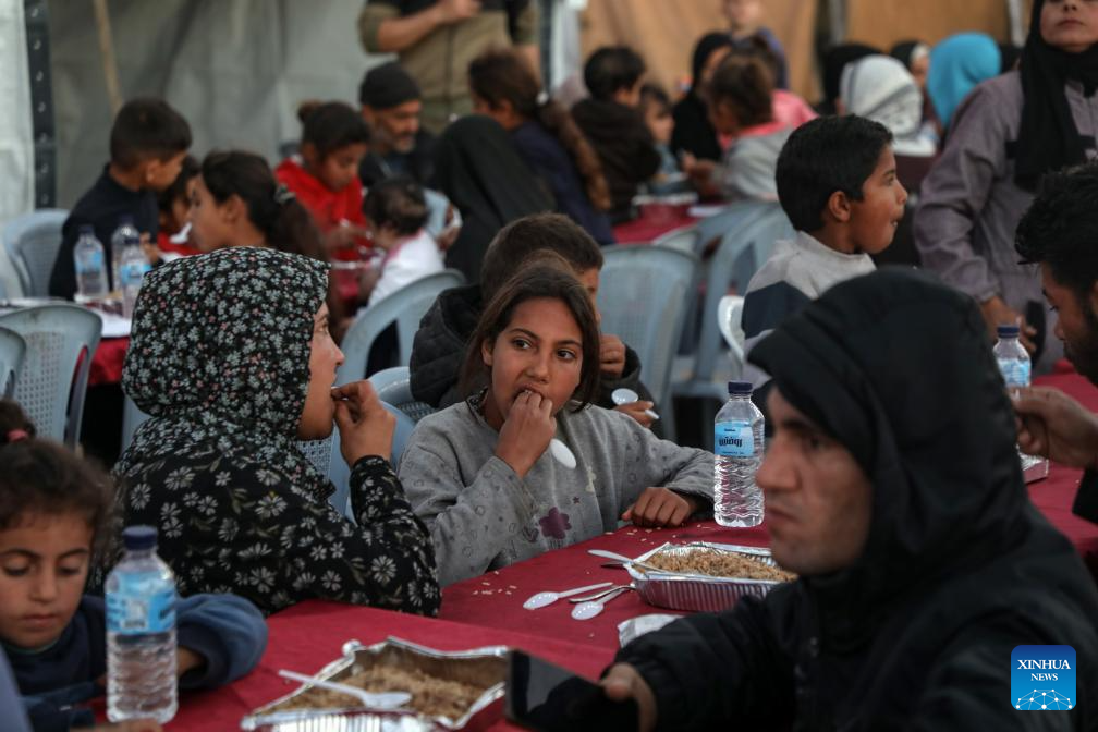 Palestinians gather for a group Ramadan iftar among tents for displaced people in the Netzarim area in the central Gaza Strip, on Feb. 21, 2026. (Photo by Rizek Abdeljawad/Xinhua)
