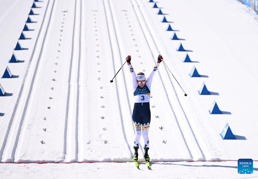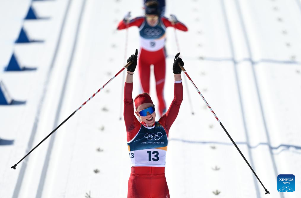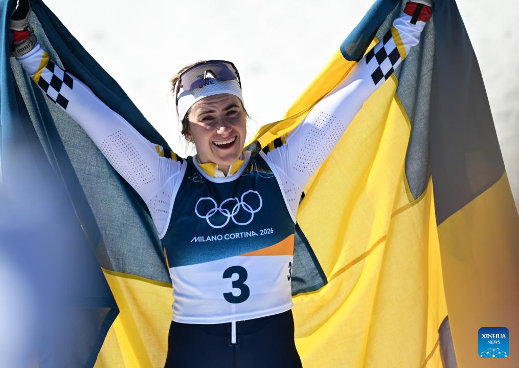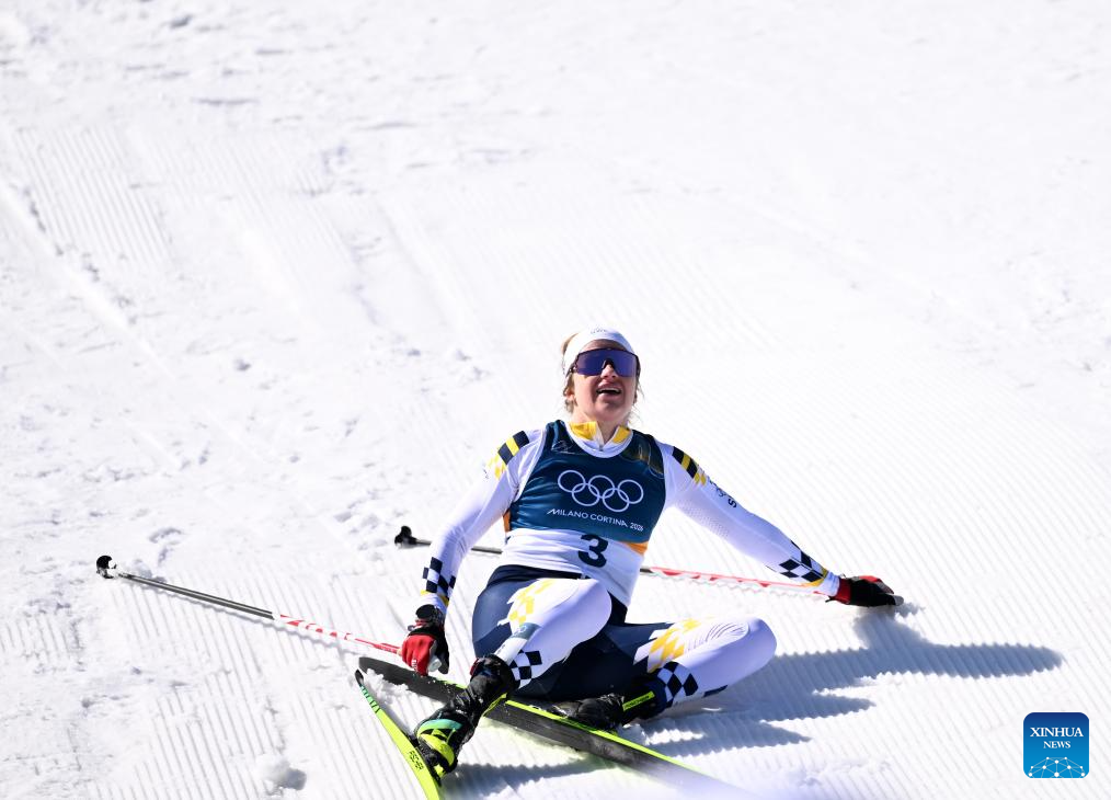 Ebba Andersson of Sweden cheers after crossing the finish line during the cross-country skiing women's 50km mass start classic match at the Milan-Cortina 2026 Olympic Winter Games in Tesero, Italy, Feb. 22, 2026. (Xinhua/He Canling)