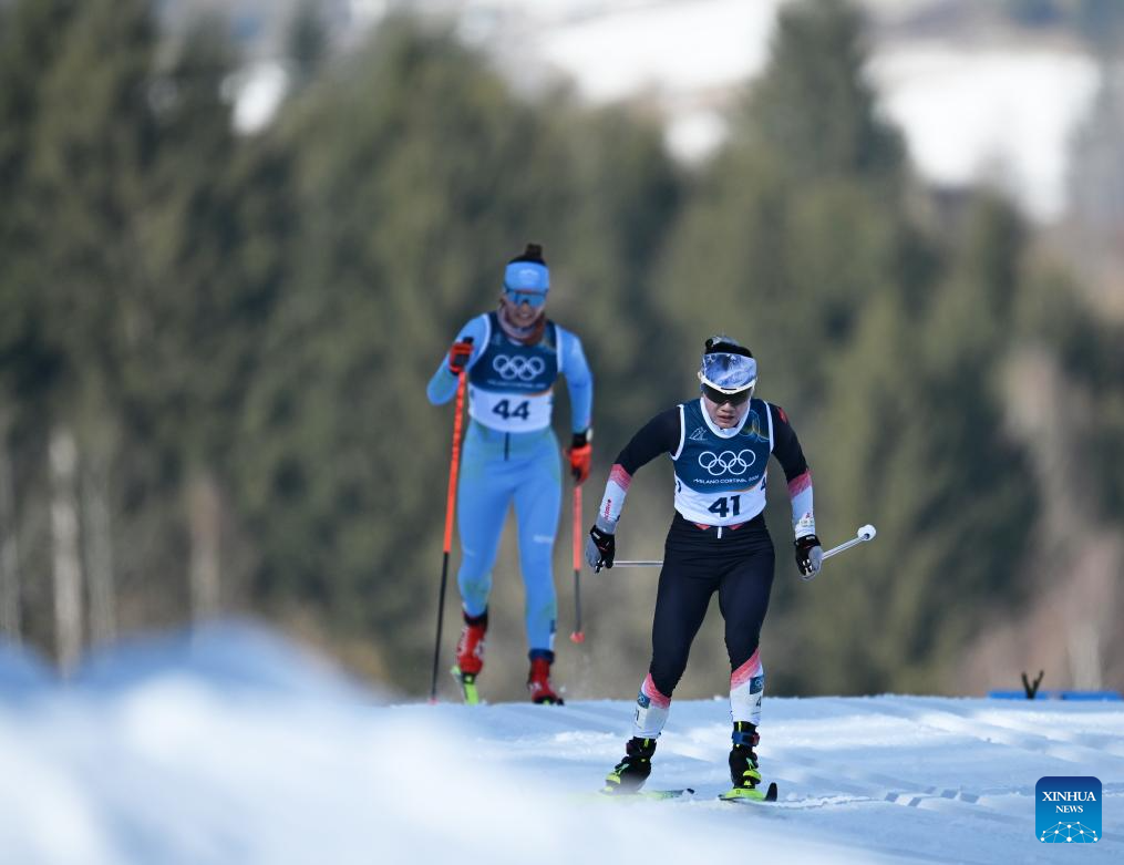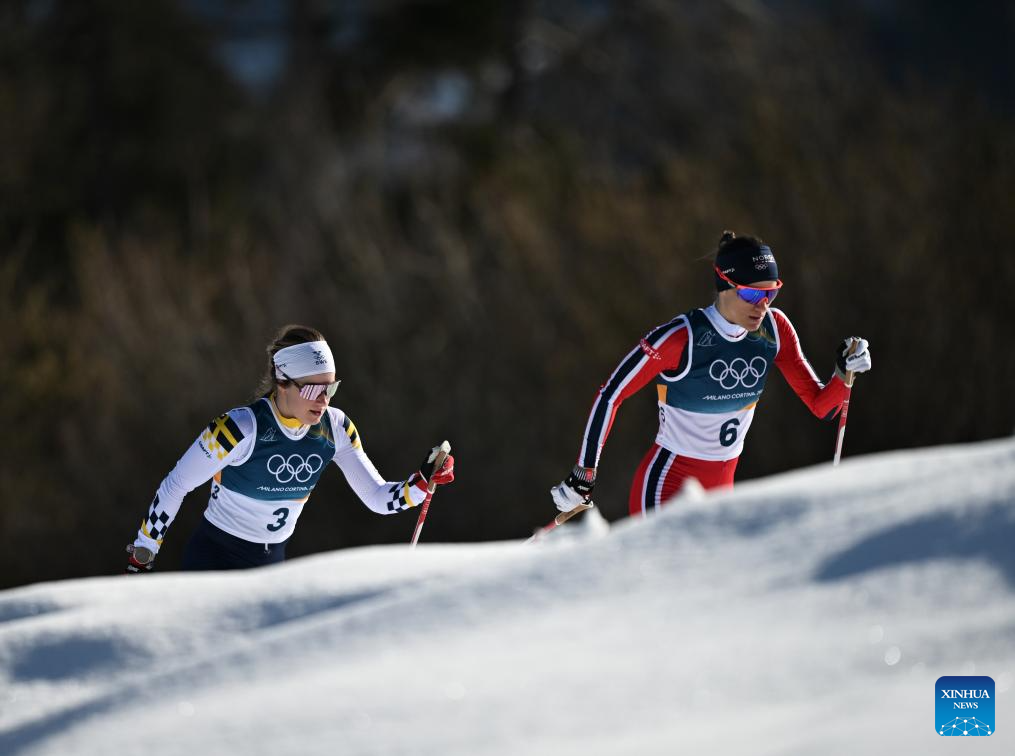 Chi Chunxue (R) of China competes during the cross-country skiing women's 50km mass start classic match at the Milan-Cortina 2026 Olympic Winter Games in Tesero, Italy, Feb. 22, 2026. (Xinhua/He Canling)