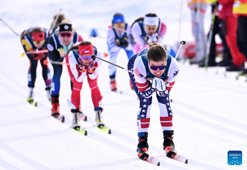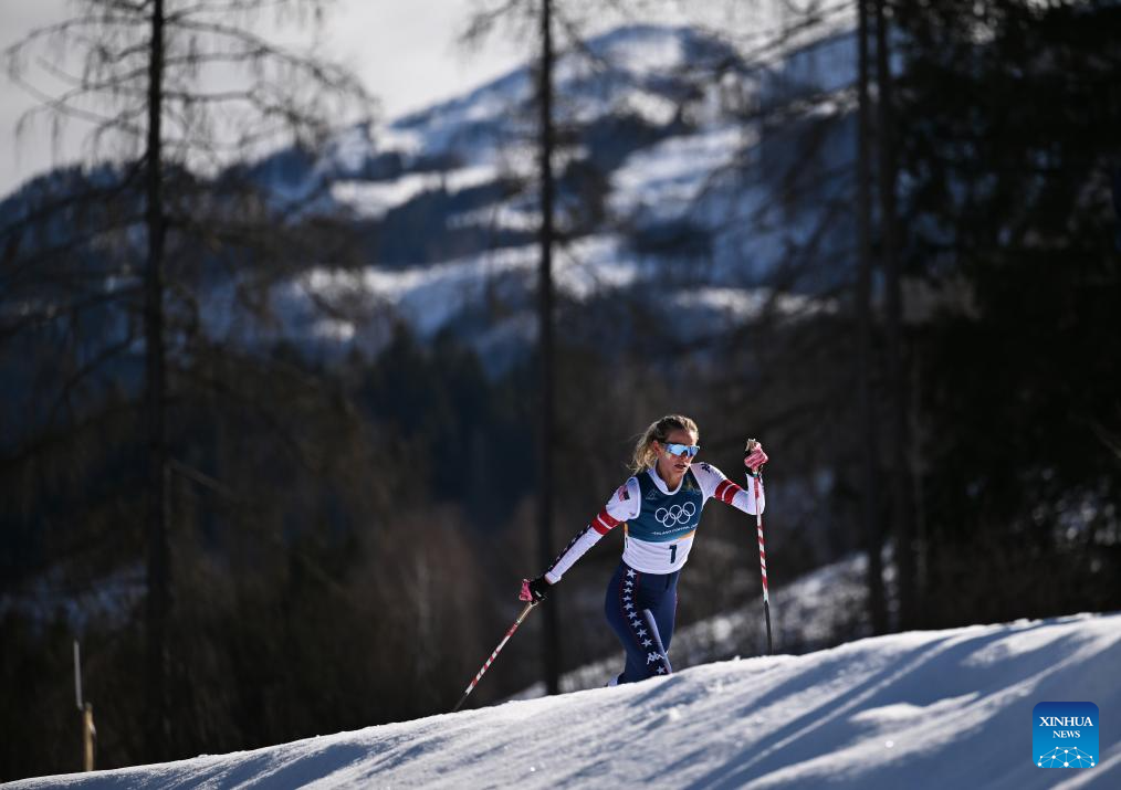 Jessie Diggins of the United States competes during the cross-country skiing women's 50km mass start classic match at the Milan-Cortina 2026 Olympic Winter Games in Tesero, Italy, Feb. 22, 2026. (Xinhua/He Canling)