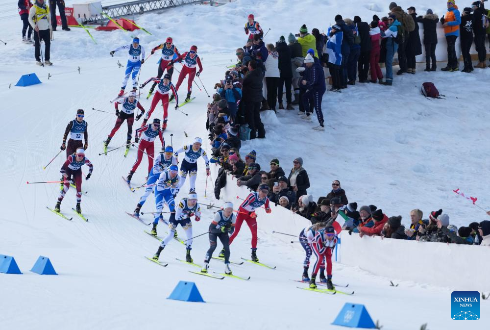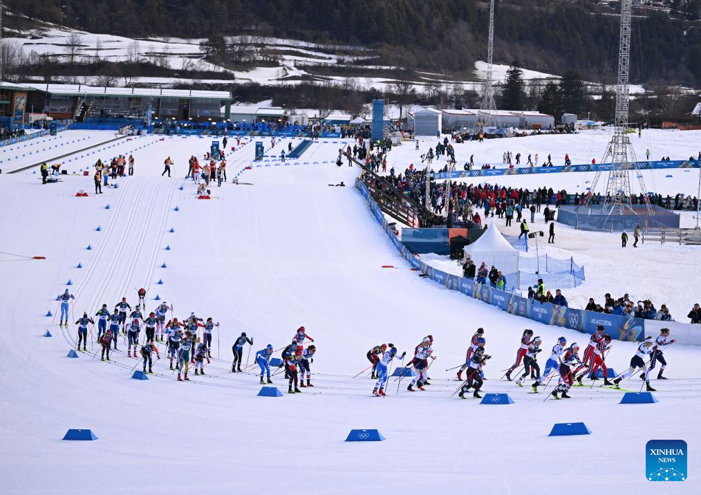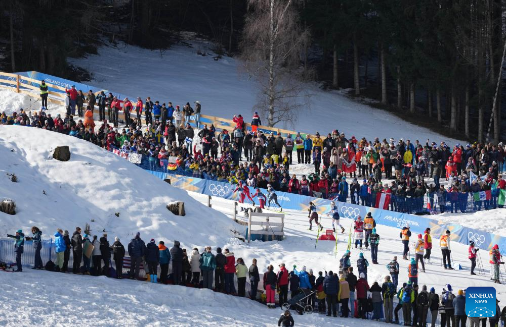 Athletes compete during the cross-country skiing women's 50km mass start classic match at the Milan-Cortina 2026 Olympic Winter Games in Tesero, Italy, Feb. 22, 2026. (Xinhua/He Canling)