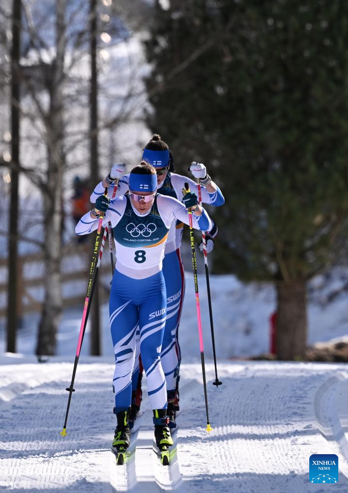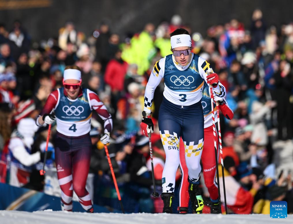 Ebba Andersson (R) of Sweden competes during the cross-country skiing women's 50km mass start classic match at the Milan-Cortina 2026 Olympic Winter Games in Tesero, Italy, Feb. 22, 2026. (Xinhua/He Canling)