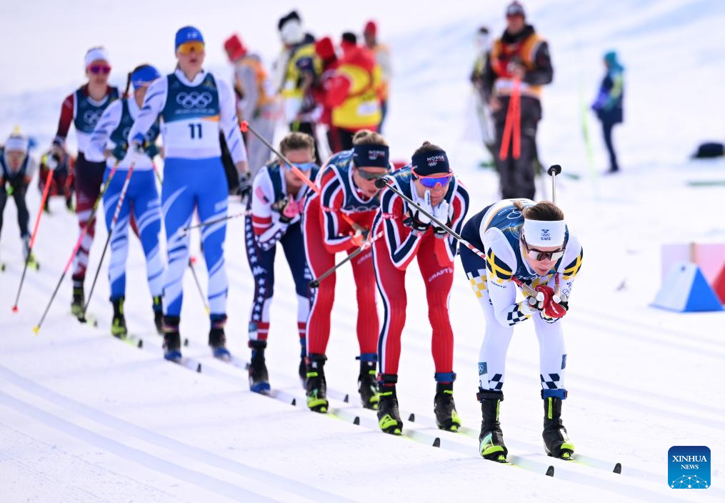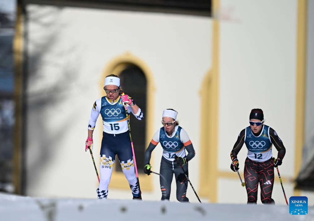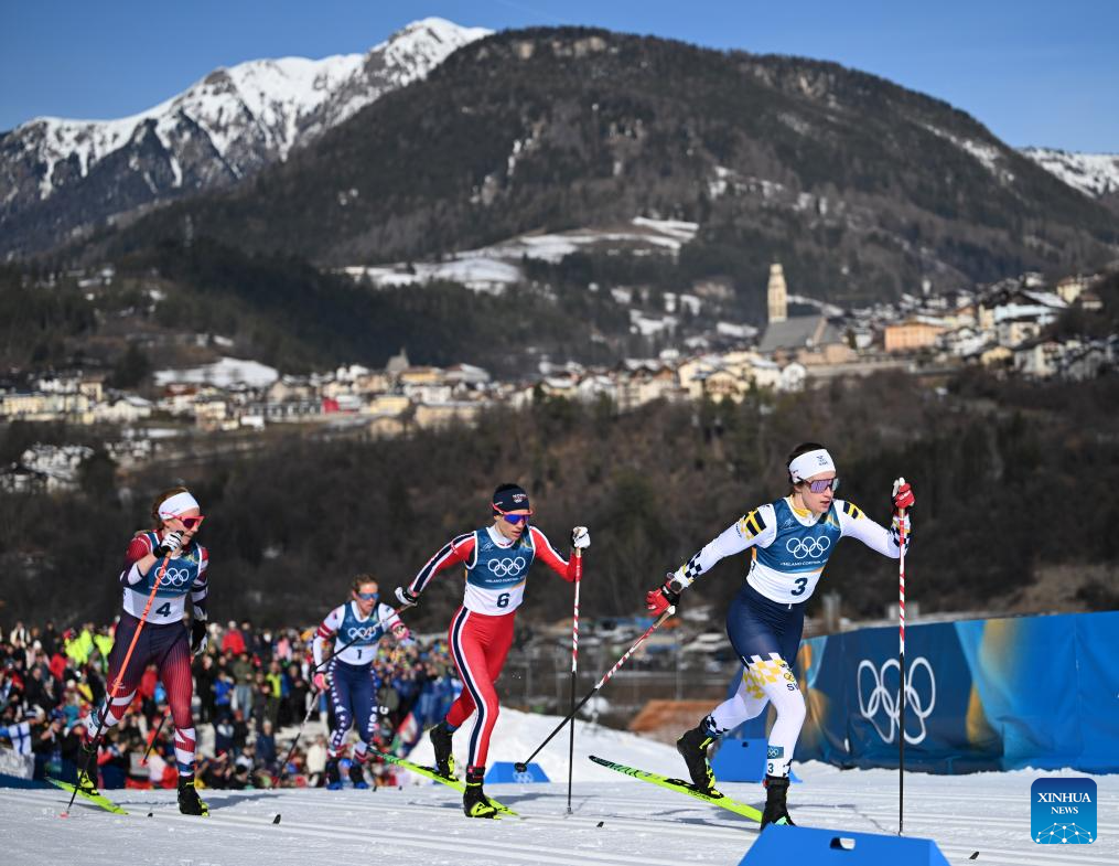 Ebba Andersson (1st R) of Sweden competes during the cross-country skiing women's 50km mass start classic match at the Milan-Cortina 2026 Olympic Winter Games in Tesero, Italy, Feb. 22, 2026. (Xinhua/He Canling)