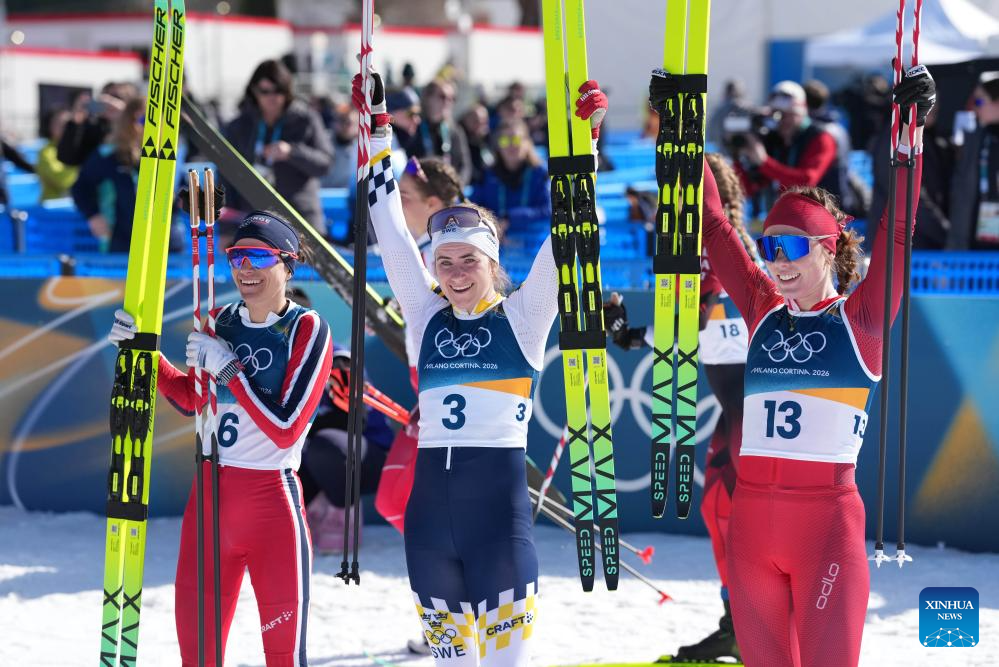 Ebba Andersson (C) of Sweden, Heidi Weng (L) of Norway and Nadja Kaelin of Switzerland pose after the cross-country skiing women's 50km mass start classic match at the Milan-Cortina 2026 Olympic Winter Games in Tesero, Italy, Feb. 22, 2026. (Xinhua/Meng Yongmin)